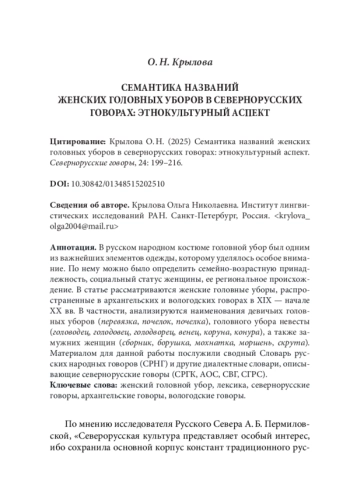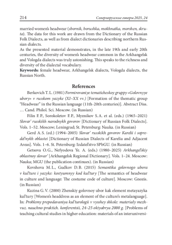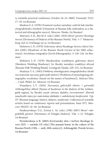 8. Ненашева Л. В. (2016) Названия головных уборов в говорах Архангельской области. // Русский язык: история, диалекты, современность. Сборник научных статей по материалам докладов и сообщений конференции. Вып. XV. М.: МГОУ: 41-46.