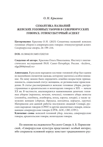 В русском народном костюме головной убор был одним из важнейших элементов одежды, которому уделялось особое внимание. По нему можно было определить семейно-возрастную принадлежность, социальный статус женщины, ее региональное происхождение. В статье рассматриваются женские головные уборы, распространенные в архангельских и вологодских говорах в XIX — начале XX вв. В частности, анализируются наименования девичьих головных уборов (перевязка, почелок, почелка), головного убора невесты (головодец, голодовец, голодворец, венец, коруна, конура), а также замужних женщин (сборник, борушка, мохнатка, моршень, скрута). Материалом для данной работы послужили сводный Словарь русских народных говоров (СРНГ) и другие диалектные словари, описывающие севернорусские говоры (СРГК, АОС, СВГ, СГРС).