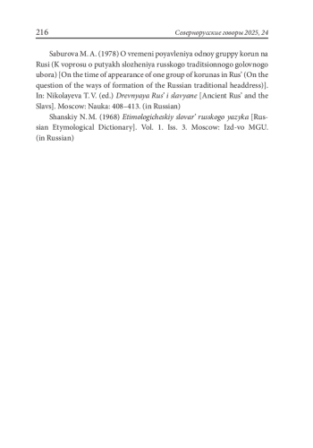 10. Сабурова М. А. (1978) О времени появления одной группы корун на Руси (К вопросу о путях сложения русского традиционного головного убора). // Древняя Русь и славяне. Отв. ред. Т. В. Николаева. М.: Наука: 408-413.