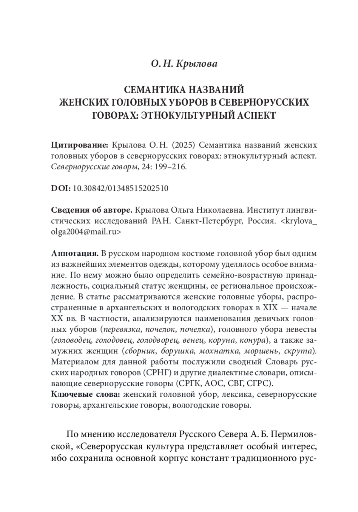По мнению исследователя Русского Севера А. Б. Пермиловской, «Северорусская культура представляет особый интерес, ибо сохранила основной корпус констант традиционного русского уклада жизни и русской ментальности» [Пермиловская 2005: 11]. Одним из важнейших элементов женского костюма был головной убор. Изучению одежды в исследовательской литературе уделено достаточное внимание, объектом специальных исследований становились в том числе и головные уборы [Зеленин 1926; Гаген-Торн 1933; Ковшова, Гудков 2015; Маслова 1978; Молотова 1970; 1978; Ненашева 2016 и др.].