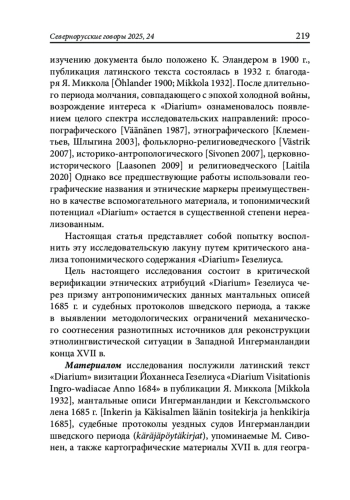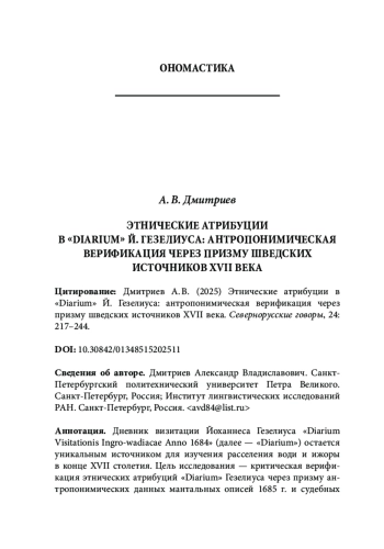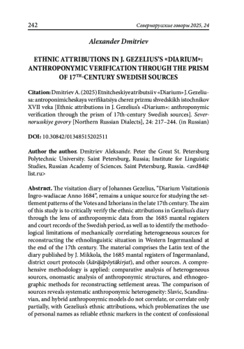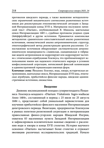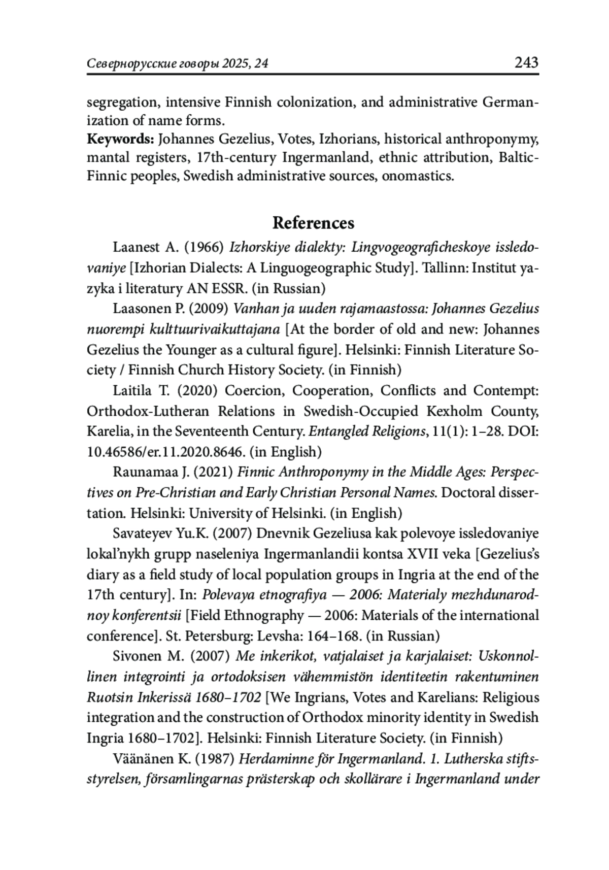 Дневник визитации Йоханнеса Гезелиуса «Diarium Visitationis Ingro-wadiacae Anno 1684» (далее — «Diarium») остается уникальным источником для изучения расселения води и ижоры в конце XVII столетия. Цель исследования — критическая верификация этнических атрибуций «Diarium» Гезелиуса через призму антропонимических данных мантальных описей 1685 г. и судебных протоколов шведского периода, а также выявление методологических ограничений механического соотнесения разнотипных источников для реконструкции этнолингвистической ситуации в Западной Ингерманландии конца XVII в. Материалом послужили латинский текст «Diarium», опубликованный Я. Миккола, мантальные описи Ингерманландии 1685 г., судебные протоколы уездных судов (käräjäpöytäkirjat) и другие источники. Применяется комплексная методология: сравнительно-сопоставительный анализ разнотипных источников, ономастический анализ антропонимических структур, этногеографический метод реконструкции ареалов расселения. Сопоставление источников обнаруживает систематическую антропонимическую неоднородность: славянская, скандинавская и гибридная модели антропонимов не коррелируют или коррелируют частично с этническими атрибуциями Гезелиуса, что проблематизирует использование имени как надежного этнического маркера в условиях конфессиональной сегрегации, интенсивной финской колонизации и административной германизации именных форм.