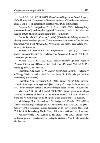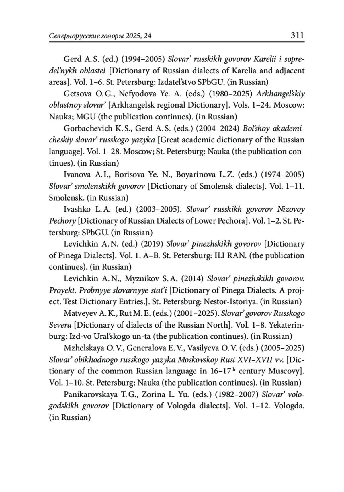 16. Словарь говоров Русского Севера. Ред. А. К. Матвеев (т. 1-5), М. Э. Рут (т. 6-8). Т. 1-8. Екатеринбург: Изд-во Уральского гос. ун-та, 2001-2025 (издание продолжается).