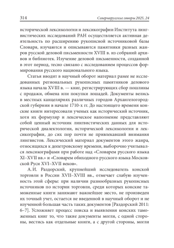 Статья вводит в научный оборот языковой материал ранее неисследованных рукописных документов Русского Севера начала XVIII в. из собрания Научно-исследовательского архива Санкт-Петербургского института истории РАН (Архив СПбИИ, ф. 10, оп. 3). Это документы, регистрирующие пошлинный сбор с покупки, продажи или обмена лошадей в начале 1710-х гг. в различных городах и местах Архангелогородской губернии: в Холмогорах, Мезени, Кевроле и Ненокоцком Усолье, на Двине недалеко от Архангельска. Исследование формуляра и лексического наполнения данных рукописных книг показало, что такие документы могут послужить важным источником для изучения делового языка, активно участвовавшего в формировании национального русского языка.