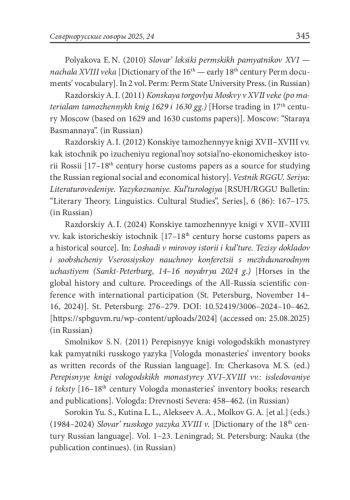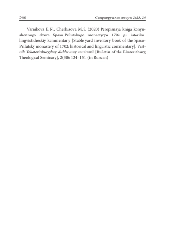 1. Варникова Е. Н., Черкасова М. С. (2020) Переписная книга конюшенного двора Спасо-Прилуцкого монастыря 1702 г.: историколингвистический комментарий. // Вестник Екатеринбургской духовной семинарии, 2 (30): 124-151.