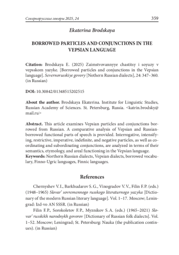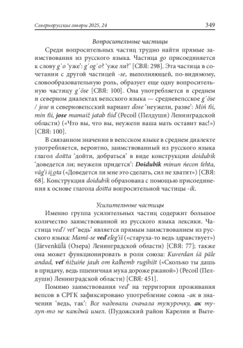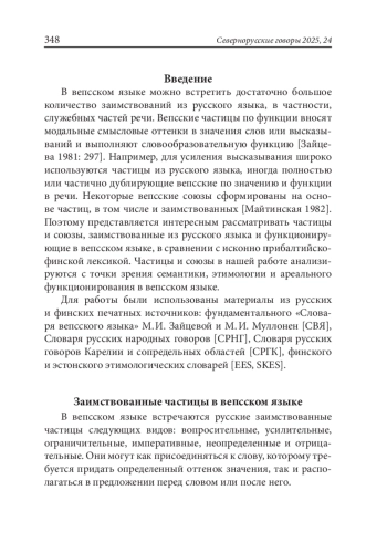 В вепсском языке можно встретить достаточно большое количество заимствований из русского языка, в частности, служебных частей речи. Вепсские частицы по функции вносят модальные смысловые оттенки в значения слов или высказываний и выполняют словообразовательную функцию [Зайцева 1981: 297]. Например, для усиления высказывания широко используются частицы из русского языка, иногда полностью или частично дублирующие вепсские по значению и функции в речи. Некоторые вепсские союзы сформированы на основе частиц, в том числе и заимствованных [Майтинская 1982]. Поэтому представляется интересным рассматривать частицы и союзы, заимствованные из русского языка и функционирующие в вепсском языке, в сравнении с исконно прибалтийско-финской лексикой. Частицы и союзы в нашей работе анализируются с точки зрения семантики, этимологии и ареального функционирования в вепсском языке.