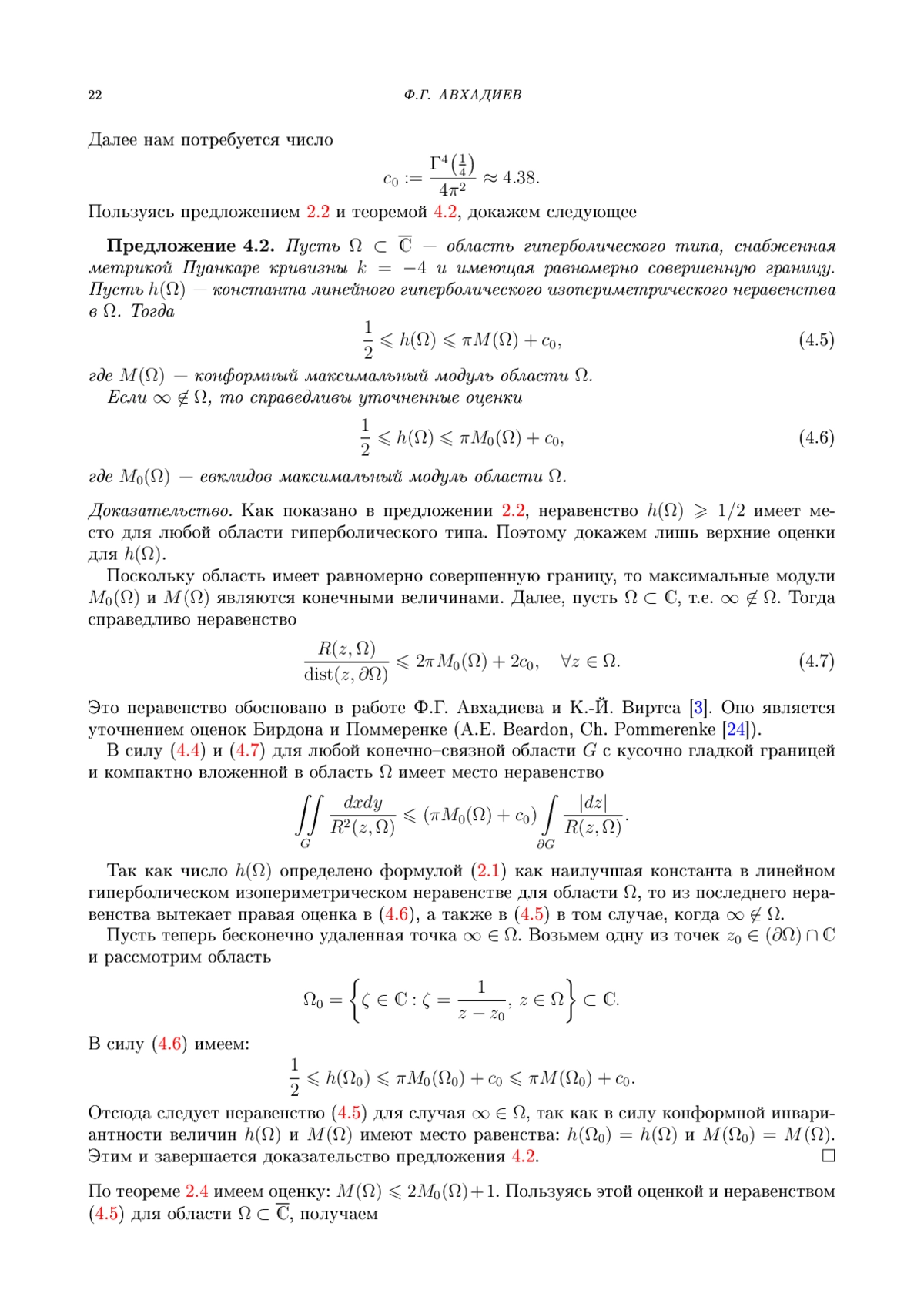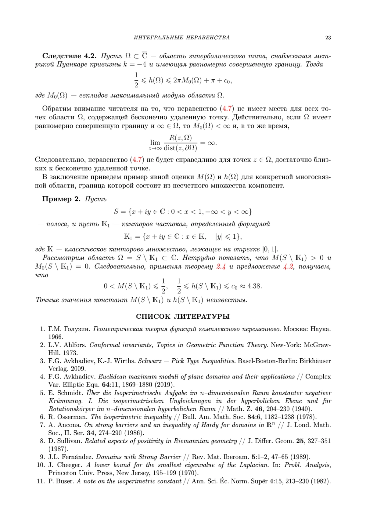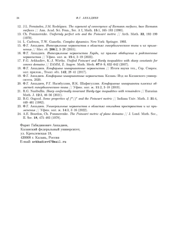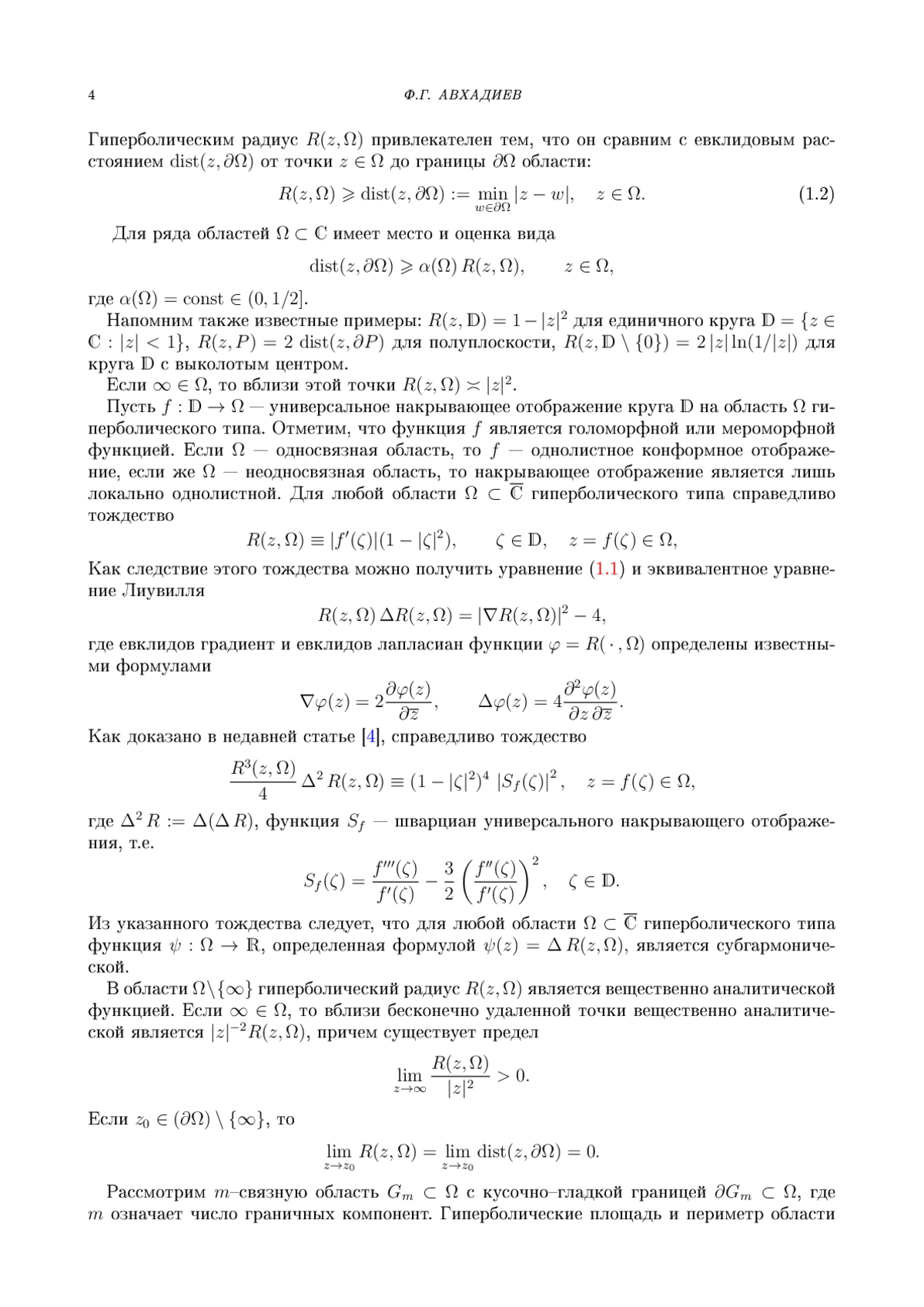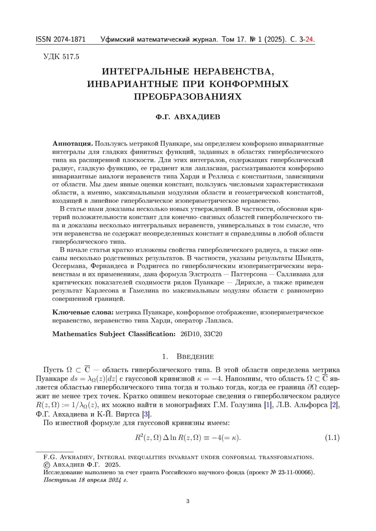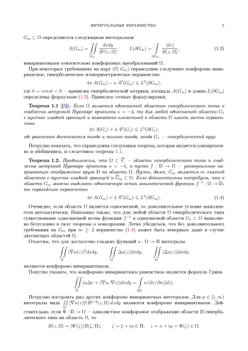 Пользуясь метрикой Пуанкаре, мы определяем конформно инвариантные интегралы для гладких финитных функций, заданных в областях гиперболического типа на расширенной плоскости. Для этих интегралов, содержащих гиперболический радиус, гладкую функцию, ее градиент или лапласиан, рассматриваются конформно инвариантные аналоги неравенств типа Харди и Реллиха с константами, зависящими от области. Мы даем явные оценки констант, пользуясь числовыми характеристиками области, а именно, максимальными модулями области и геометрической константой, входящей в линейное гиперболическое изопериметрическое неравенство. В статье нами доказаны несколько новых утверждений. В частности, обоснован критерий положительности констант для конечно–связных областей гиперболического типа и доказаны несколько интегральных неравенств, универсальных в том смысле, что эти неравенства не содержат неопределенных констант и справедливы в любой области гиперболического типа. В начале статьи кратко изложены свойства гиперболического радиуса, а также описаны несколько родственных результатов. В частности, указаны результаты Шмидта, Оссермана, Фернандеса и Родригеса по гиперболическим изопериметрическим неравенствам и их применениям, дана формула Элстродта — Паттерсона — Салливана для критических показателей сходимости рядов Пуанкаре — Дирихле, а также приведен результат Карлесона и Гамелина по максимальным модулям области с равномерно совершенной границей