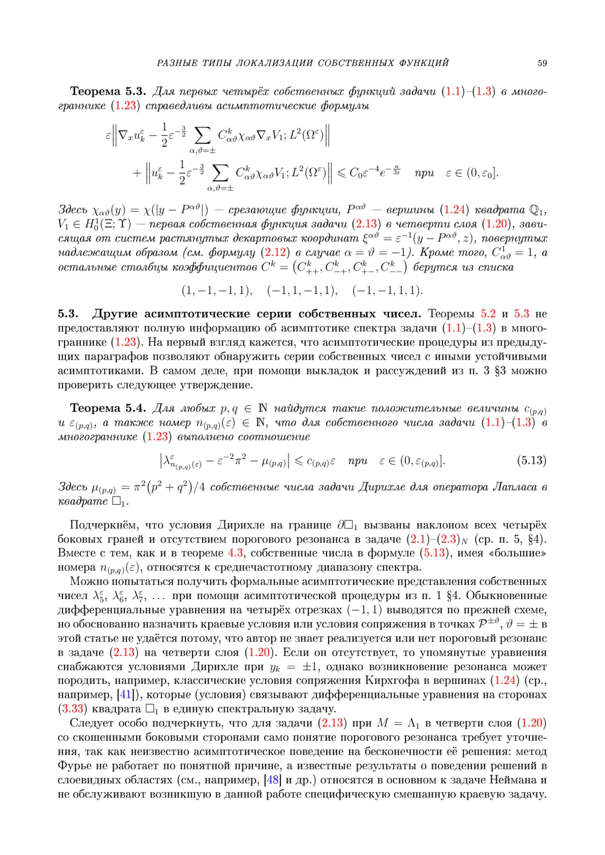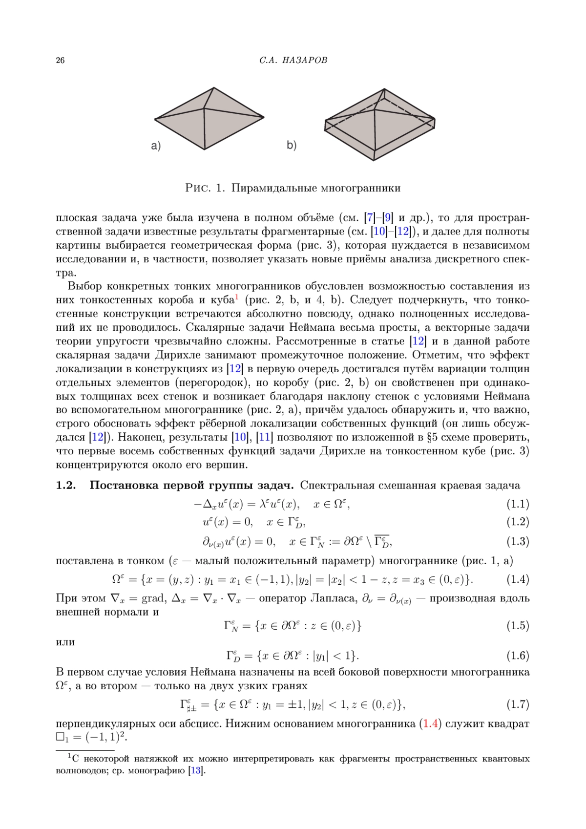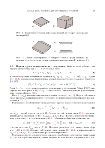 Построена асимптотика собственных пар смешанной краевой задачи для оператора Лапласа в тонком многограннике с параллельными сближенными основаниями и скошенными узкими боковыми гранями. На основаниях назначены условия Дирихле, а на боковых гранях — условия Дирихле или Неймана, распределение которых по граням, а также углы наклона последних оказывают существенное влияние на поведение собственных функций при истончении области. Обнаружены ситуации, в которых собственные функции распределены вдоль всего многогранника и локализованы около его боковых граней или вершин. Результаты основаны на анализе спектра (точка отсечки, изолированные собственные числа, пороговые резонансы и пр.) вспомогательных задач в полуполосе и четверти слоя со скошенными торцом и боковыми сторонами соответственно. Сформулированы открытые вопросы, относящиеся как к спектральному, так и асимптотическому анализу