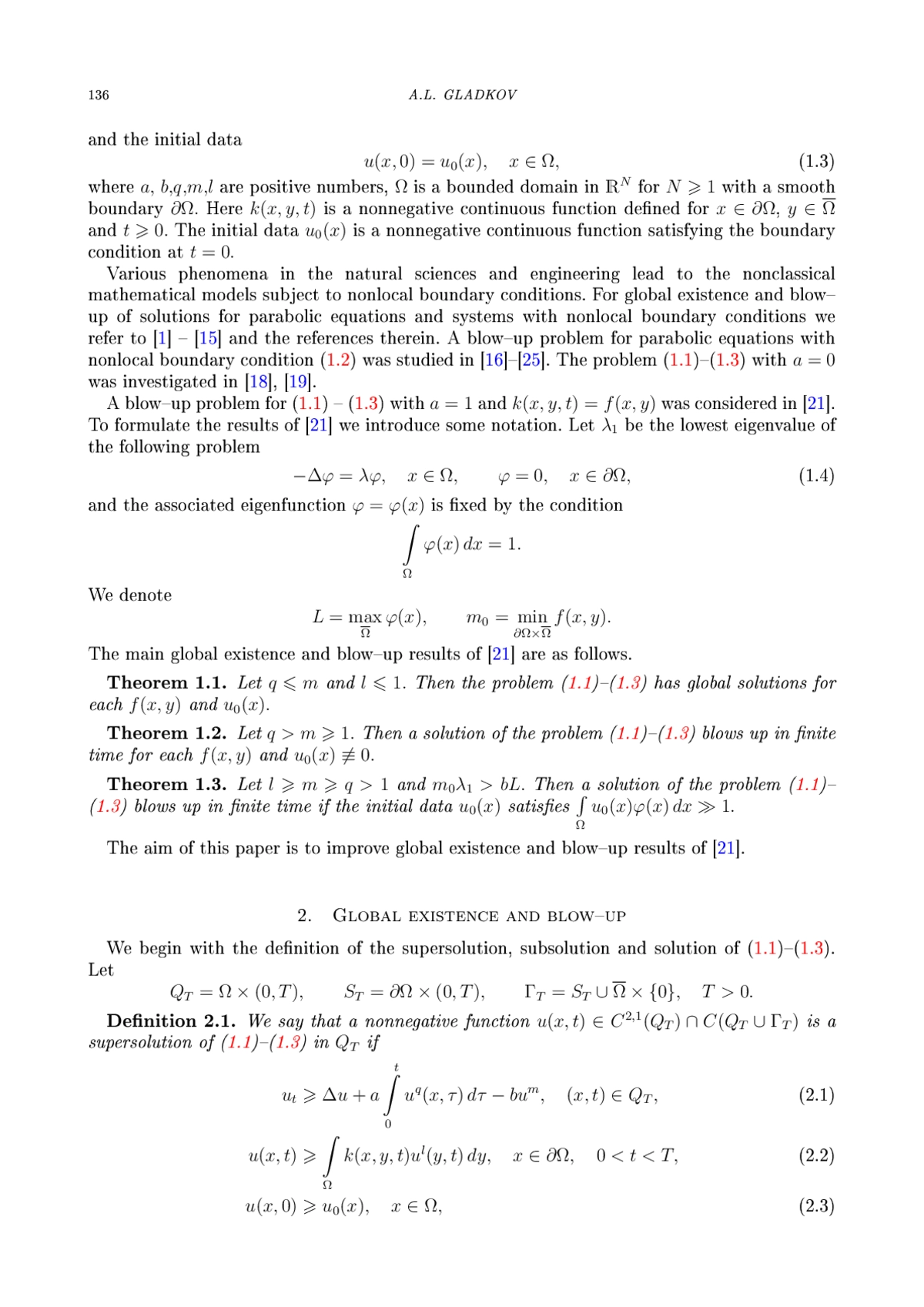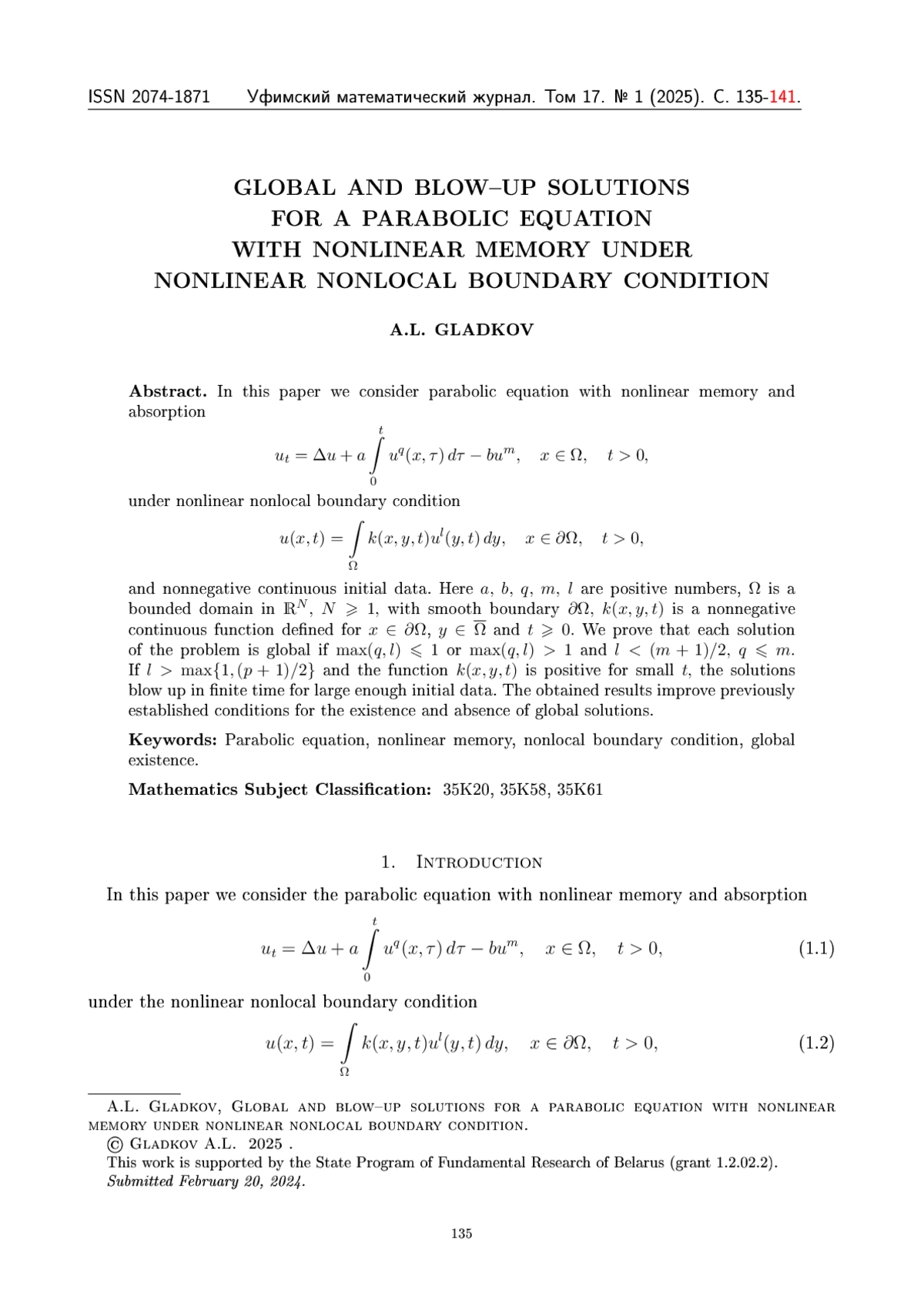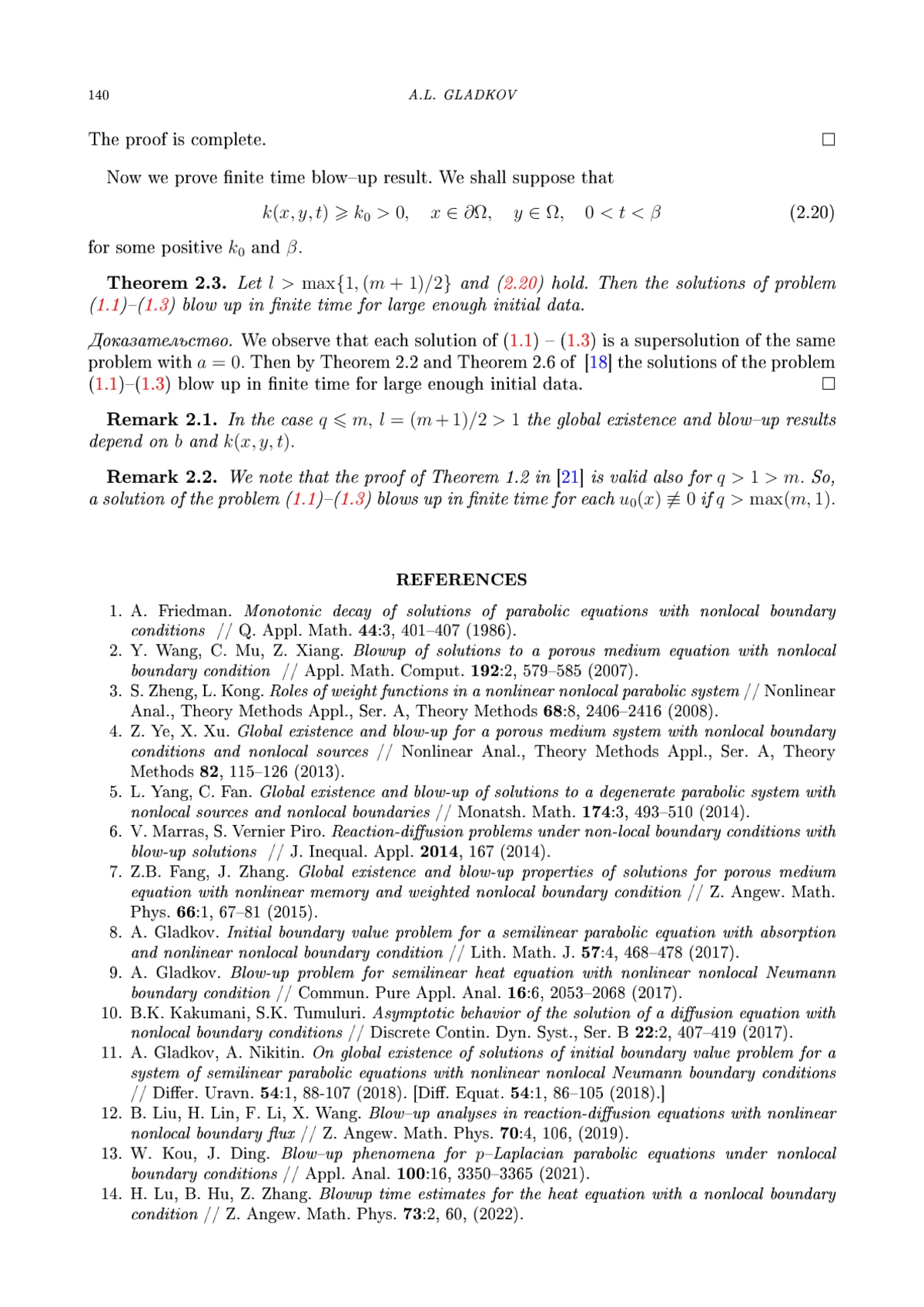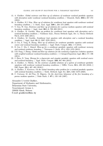 9. A. Gladkov. Blow-up problem for semilinear heat equation with nonlinear nonlocal Neumann boundary condition // Commun. Pure Appl. Anal. 16:6, 2053-2068 (2017).
