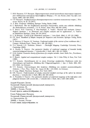 7. Н.Н. Накипов, С.Р. Насыров. Параметрический метод нахождения акцессорных параметров в обобщенных интегралах Кристоффеля-Шварца // Уч. зап. Казан. унив. Сер. физ.-мат. науки. 158:2, 202-220 (2016).