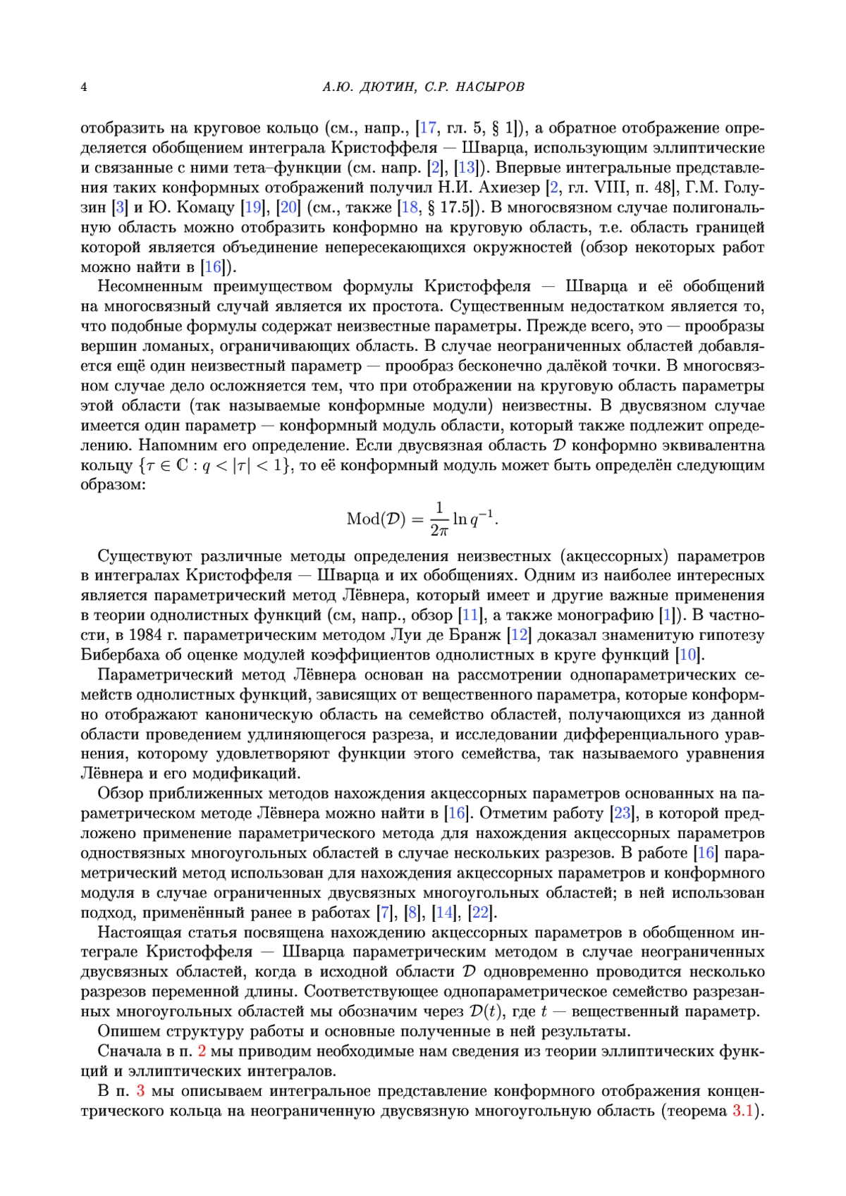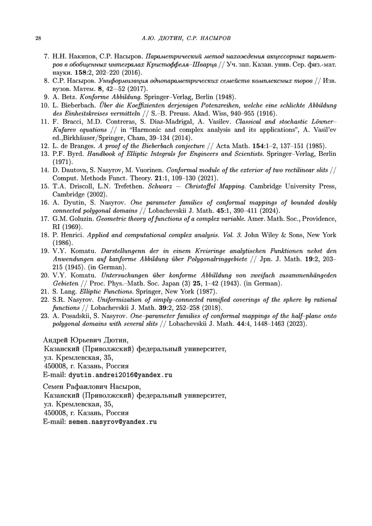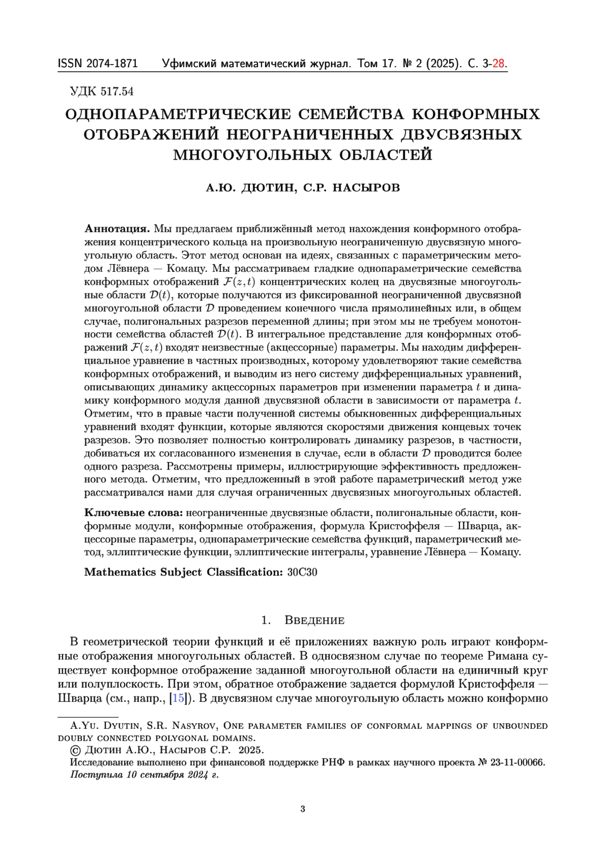 16. A. Dyutin, S. Nasyrov. One parameter families of conformal mappings of bounded doubly connected polygonal domains // Lobachevskii J. Math. 45:1, 390-411 (2024).