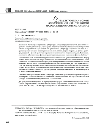 В статье рассматриваются субкультуры, которые представляет собой динамичное социальное явление, отражающее разнообразие человеческого опыта, стремление к самовыражению и поиск альтернативных форм социальной организации. Субкультуры возникают как ответ на социальные, экономические и культурные изменения, являясь, с одной стороны, средством адаптации, а с другой формой протеста и выражения независимости со стороны молодежи. В статье анализируются субкультуры как форма репрезентации классового и расового конфликта. Субкультуры возникают, когда доминирующая идеология теряет контроль, а маргинализированные группы создают альтернативные значения. Современные молодежные субкультуры представляют собой уникальные формы коллективной идентичности, выражающие альтернативные ценности, нормы, символику и стили жизни в рамках общей культуры. В статье показывается, что в медиасреде субкультуры зачастую не имеют четких границ, они превратились в «постсубкультуры». Изучение различных типов субкультур позволяет лучше понять механизмы социализации в молодежной среде, конфликты ценностей социальных групп и процессы идентификации личности, проанализировать их роль в социальной динамике.