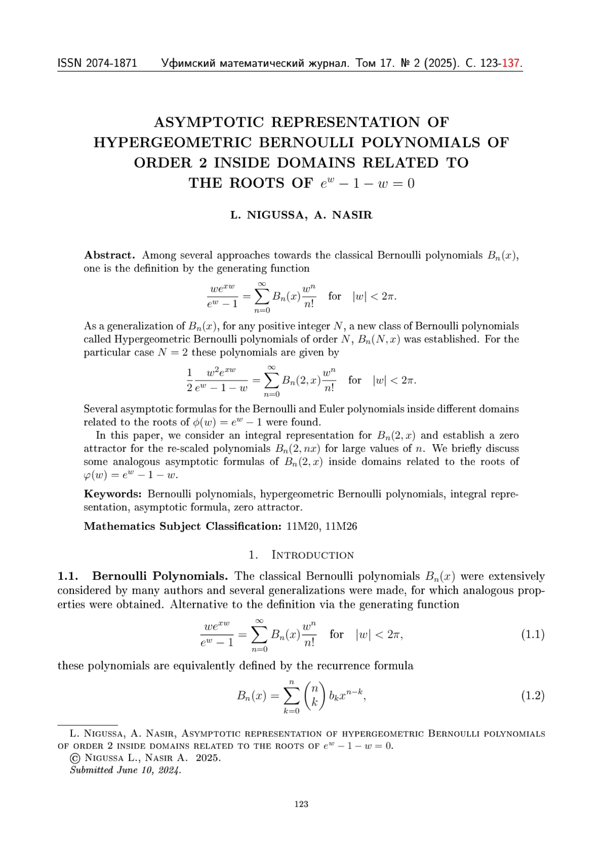 1. N. Asfaw and A. Hassen. Asymptotic behavior and zeros of hypergeometric Bernoulli polynomials of order 2 // JP J. Algebra Number Theory Appl. 49:1, 51-75 (2021). DOI: 10.17654/NT049010051