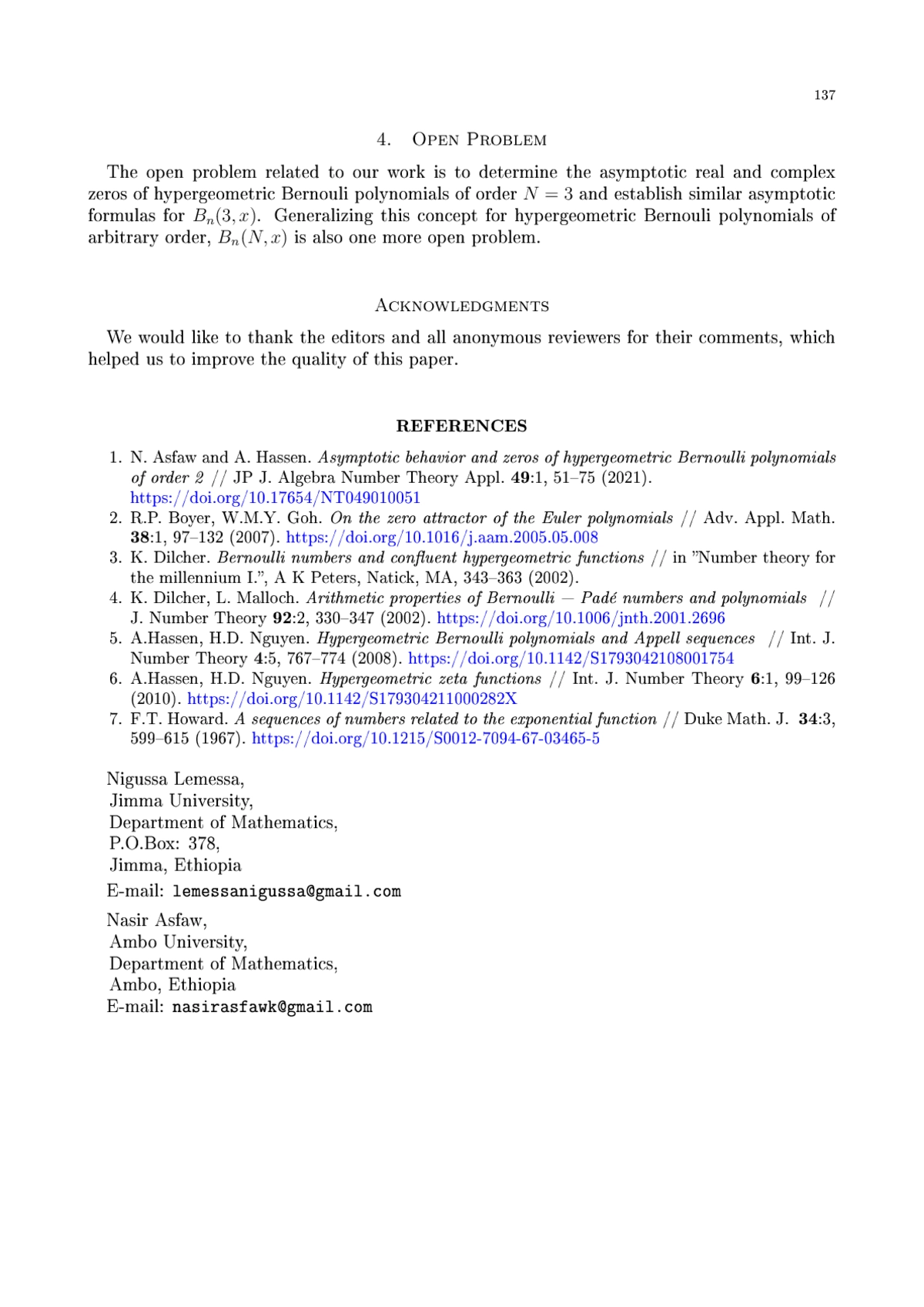 5. A.Hassen, H.D. Nguyen. Hypergeometric Bernoulli polynomials and Appell sequences // Int. J. Number Theory 4:5, 767-774 (2008). DOI: 10.1142/S1793042108001754