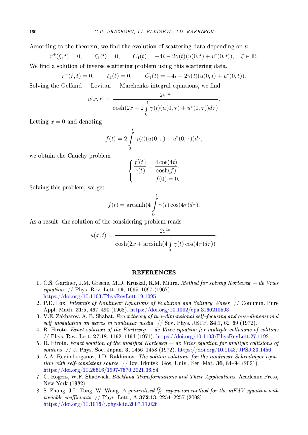 5. R. Hirota. Exact solution of the modified Korteweg - de Vries equation for multiple collisions of solitons // J. Phys. Soc. Japan. 3, 1456-1458 (1972). DOI: 10.1143/JPSJ.33.1456