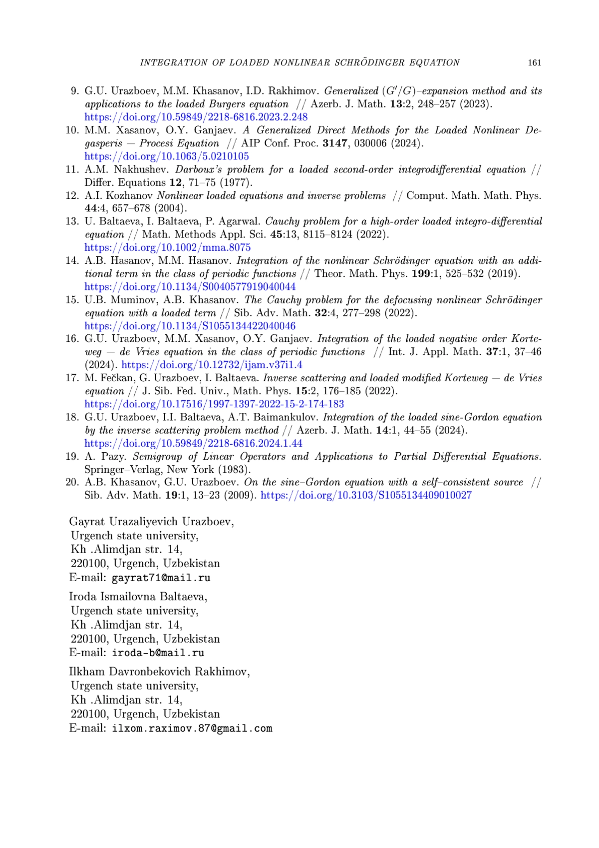6. A.A. Reyimberganov, I.D. Rakhimov. The soliton solutions for the nonlinear Schr¨odinger equation with self-consistent source // Izv. Irkutsk. Gos. Univ., Ser. Mat. 36, 84-94 (2021). DOI: 10.26516/1997-7670.2021.36.84