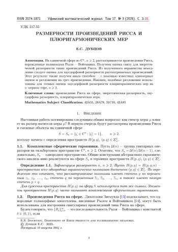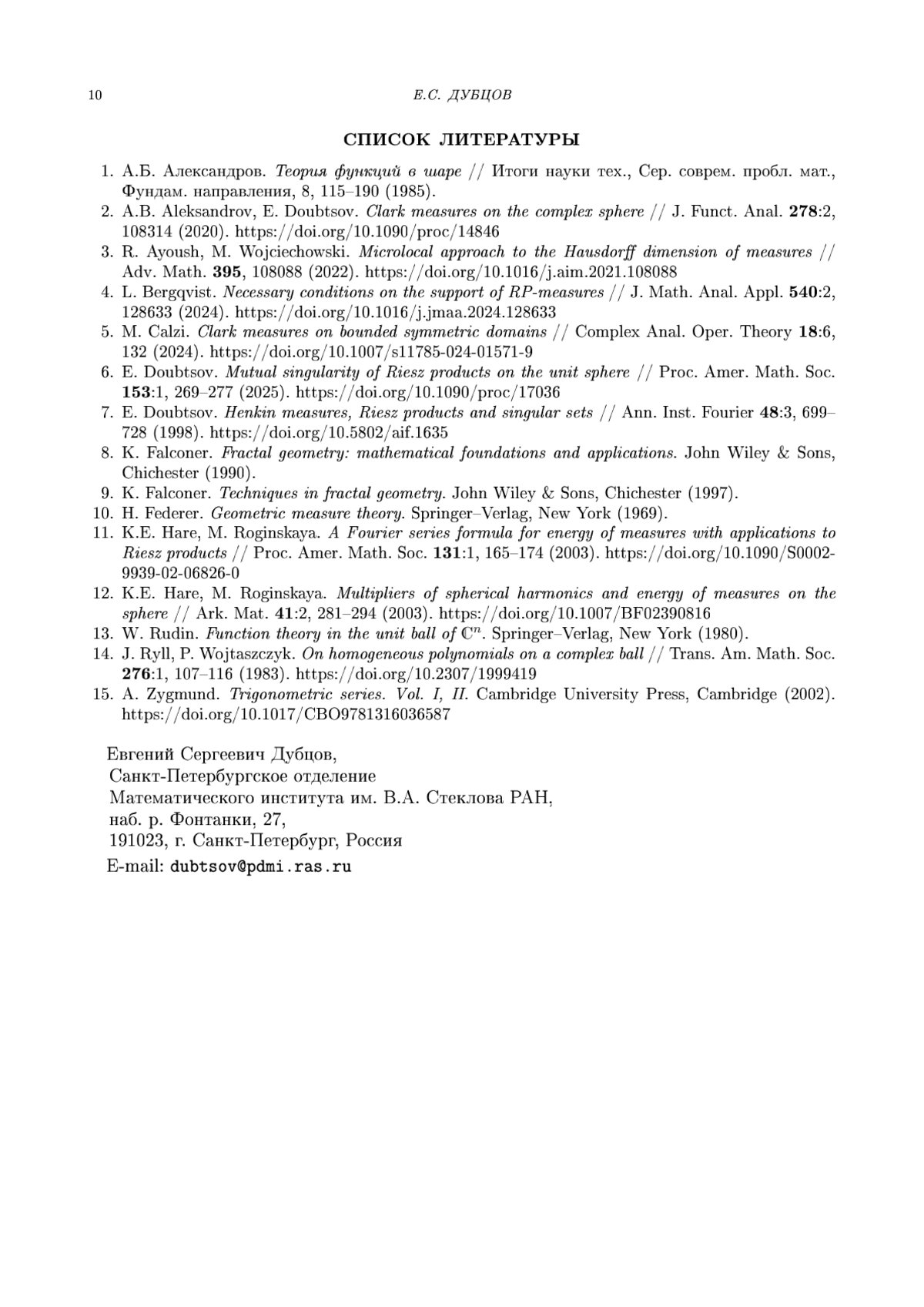 6. E. Doubtsov. Mutual singularity of Riesz products on the unit sphere // Proc. Amer. Math. Soc. 153:1, 269-277 (2025). DOI: 10.1090/proc/17036