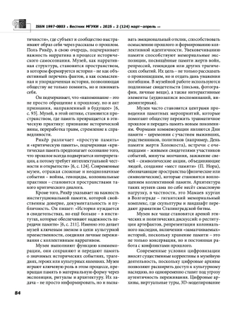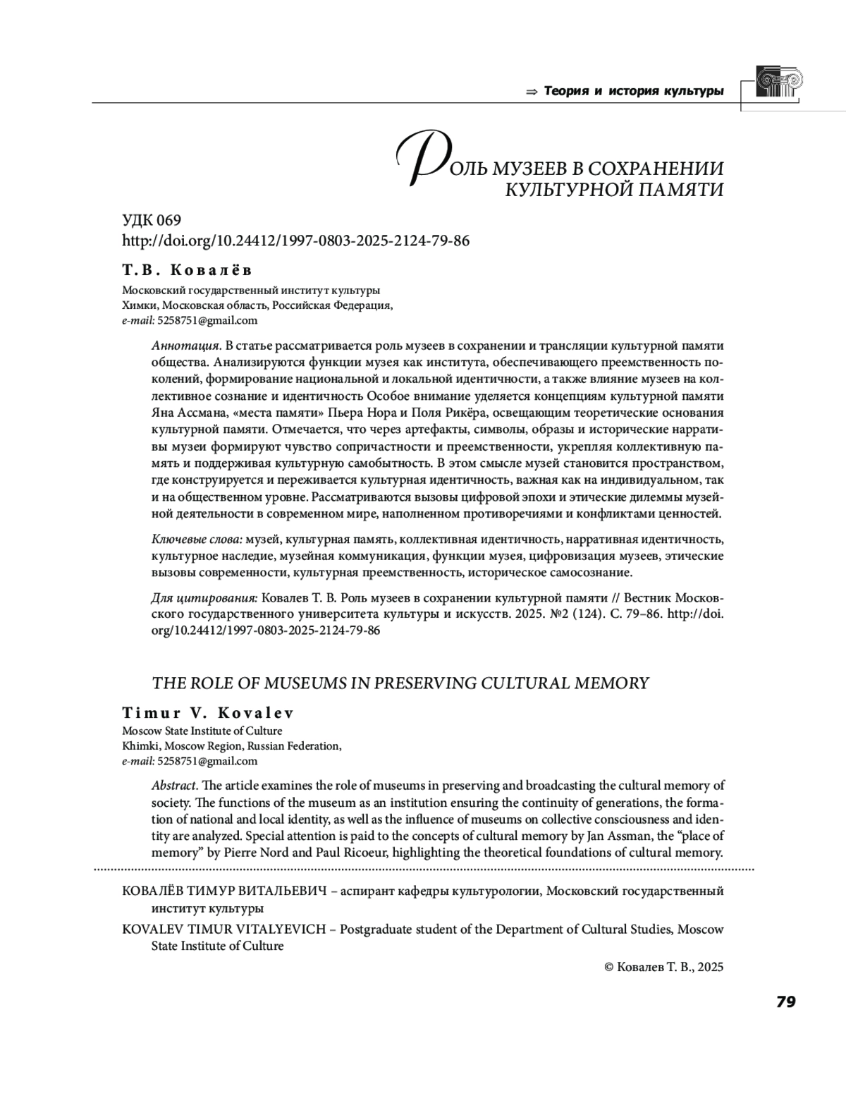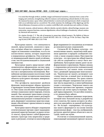 В статье рассматривается роль музеев в сохранении и трансляции культурной памяти общества. Анализируются функции музея как института, обеспечивающего преемственность поколений, формирование национальной и локальной идентичности, а также влияние музеев на коллективное сознание и идентичность Особое внимание уделяется концепциям культурной памяти Яна Ассмана, «места памяти» Пьера Нора и Поля Рикёра, освещающим теоретические основания культурной памяти. Отмечается, что через артефакты, символы, образы и исторические нарративы музеи формируют чувство сопричастности и преемственности, укрепляя коллективную память и поддерживая культурную самобытность. В этом смысле музей становится пространством, где конструируется и переживается культурная идентичность, важная как на индивидуальном, так и на общественном уровне. Рассматриваются вызовы цифровой эпохи и этические дилеммы музейной деятельности в современном мире, наполненном противоречиями и конфликтами ценностей.