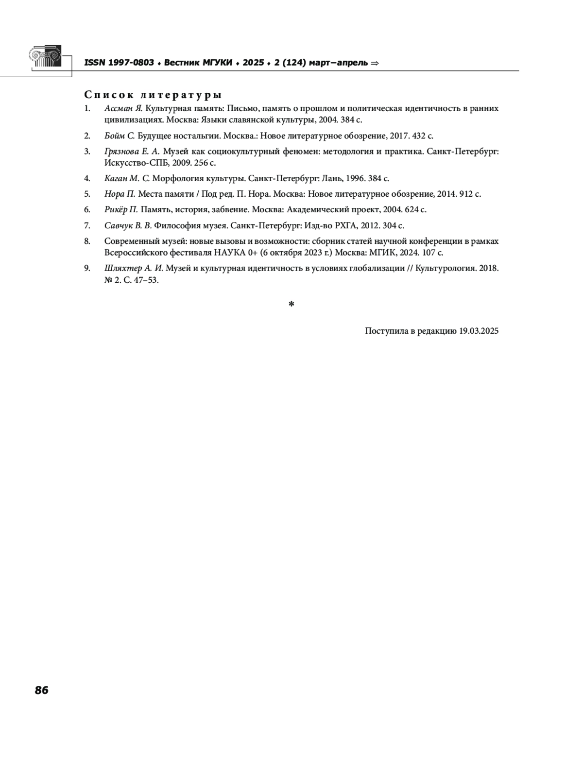 9. Шляхтер А. И. Музей и культурная идентичность в условиях глобализации // Культурология. 2018. № 2. С. 47-53.