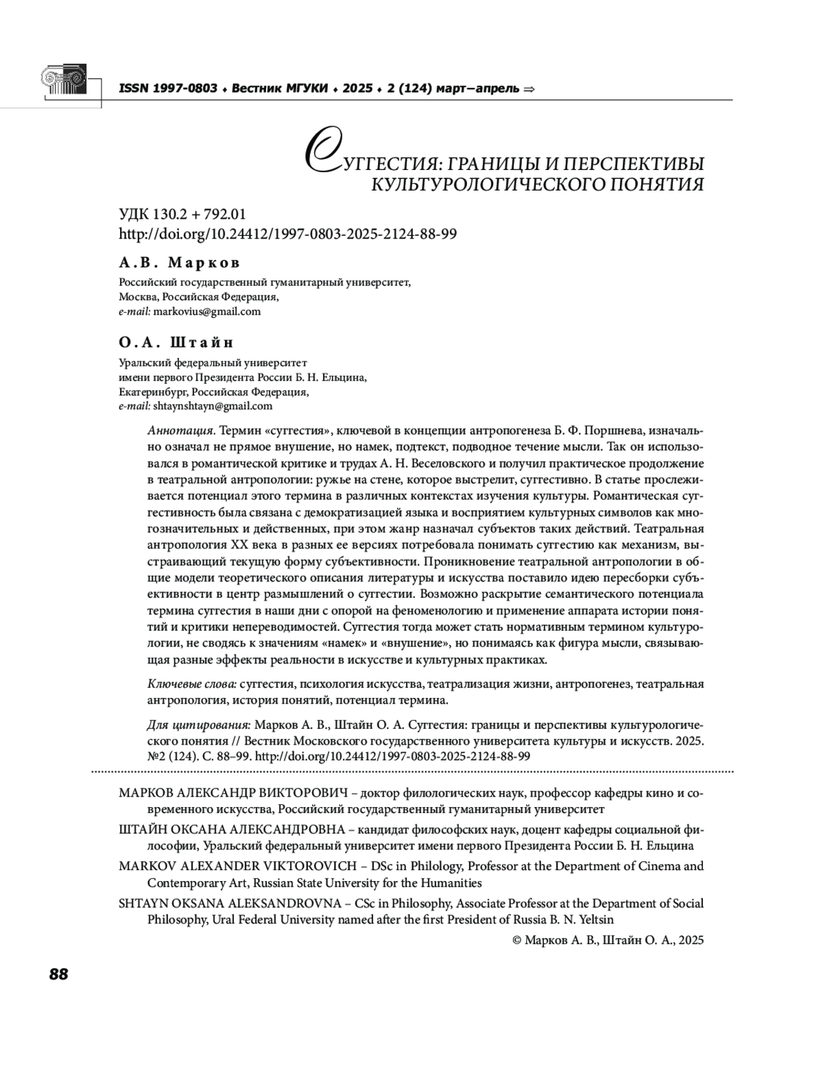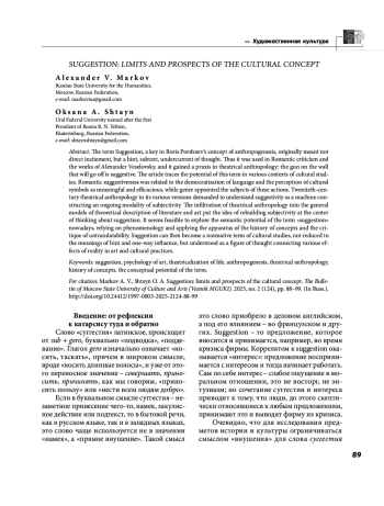 Термин «суггестия», ключевой в концепции антропогенеза Б. Ф. Поршнева, изначально означал не прямое внушение, но намек, подтекст, подводное течение мысли. Так он использовался в романтической критике и трудах А. Н. Веселовского и получил практическое продолжение в театральной антропологии: ружье на стене, которое выстрелит, суггестивно. В статье прослеживается потенциал этого термина в различных контекстах изучения культуры. Романтическая суггестивность была связана с демократизацией языка и восприятием культурных символов как многозначительных и действенных, при этом жанр назначал субъектов таких действий. Театральная антропология ХХ века в разных ее версиях потребовала понимать суггестию как механизм, выстраивающий текущую форму субъективности. Проникновение театральной антропологии в общие модели теоретического описания литературы и искусства поставило идею пересборки субъективности в центр размышлений о суггестии. Возможно раскрытие семантического потенциала термина суггестия в наши дни с опорой на феноменологию и применение аппарата истории понятий и критики непереводимостей. Суггестия тогда может стать нормативным термином культурологии, не сводясь к значениям «намек» и «внушение», но понимаясь как фигура мысли, связывающая разные эффекты реальности в искусстве и культурных практиках.