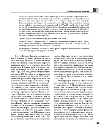 Статья посвящена анализу философских мотивов оперы Рихарда Вагнера «Парсифаль». Основное внимание в исследовании уделяется проблеме соотношения времени и вечности в музыкальной ткани произведения, а также проблеме искусства и религии в театральной мистерии Вагнера. Обосновывается тезис, что творчество Вагнера характеризуется тенденцией к незавершенному переходу от эстетического к пост эстетическому. Осуществляется сравнительный анализ «Парсифаля» с оперой Альбана Берга «Лулу», а также с кантатой Альфреда Шнитке «История доктора Иоганна Фауста». Философский анализ оперы Вагнера осуществляется в контексте концептуальных разработок А. Белого, О. Шпенглера и А. Ф. Лосева. Делается вывод, что театральная мистерия Вагнера «Парсифаль», являясь художественным произведением, одновременно обнаруживает тенденции к выходу за пределы сферы сугубо художественного. Здесь мы имеем дело с произведением искусства, которое стремится к тому, чтобы быть чем то большим, чем только произведение искусства.