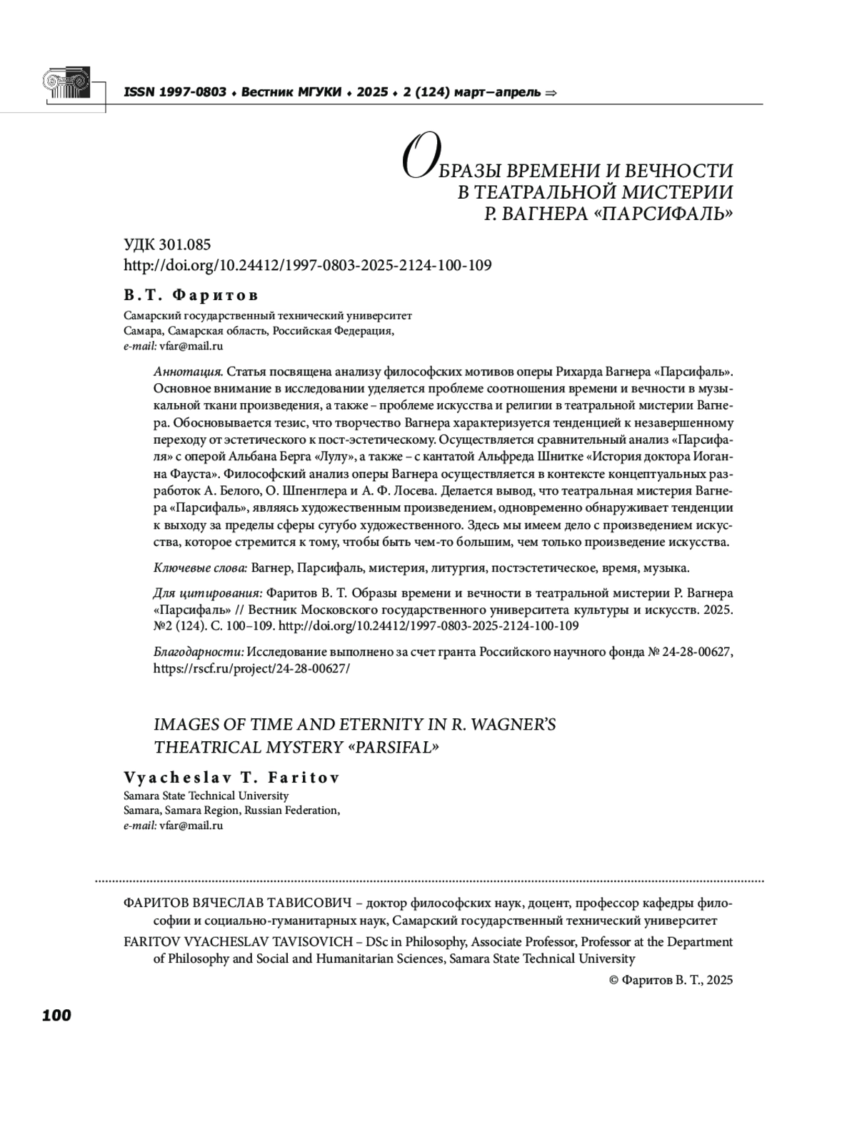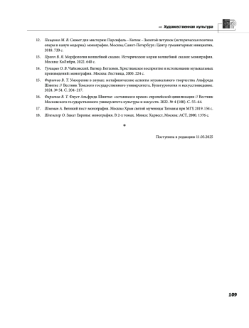 16. Фаритов В. Т. Фауст Альфреда Шнитке: “оставшееся время” европейской цивилизации // Вестник Московского государственного университета культуры и искусств. 2022. № 4 (108). С. 55-64. EDN: LNKJSR