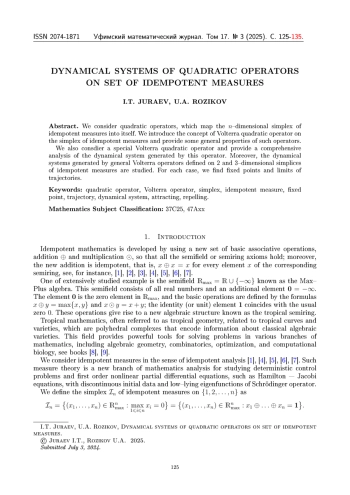 12. I.T. Juraev. Dynamics of quadratic operators of idempotent measures // Lobachevskii J. Math. 43:8, 2145-2154 (2022). DOI: 10.1134/S1995080222110130
