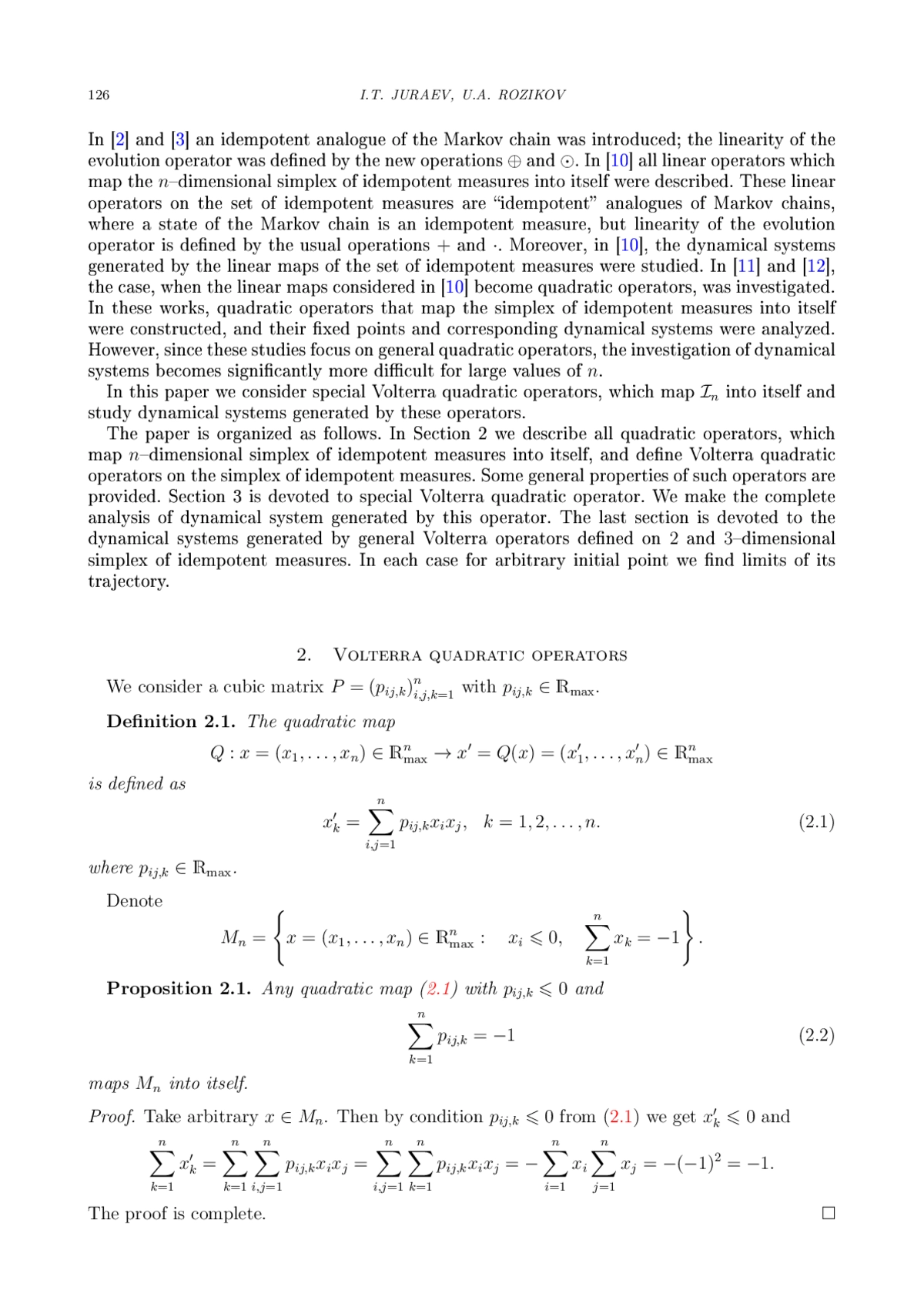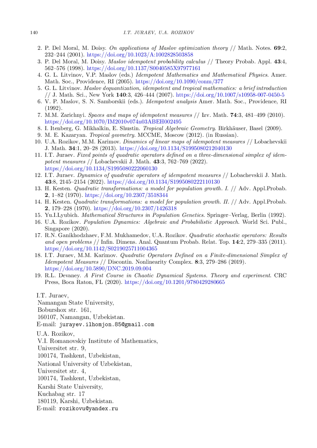 18. I.T. Juraev, M.M. Karimov. Quadratic Operators Defined on a Finite-dimensional Simplex of Idempotent Measures // Discontin. Nonlinearity Complex. 8:3, 279-286 (2019). DOI: 10.5890/DNC.2019.09.004