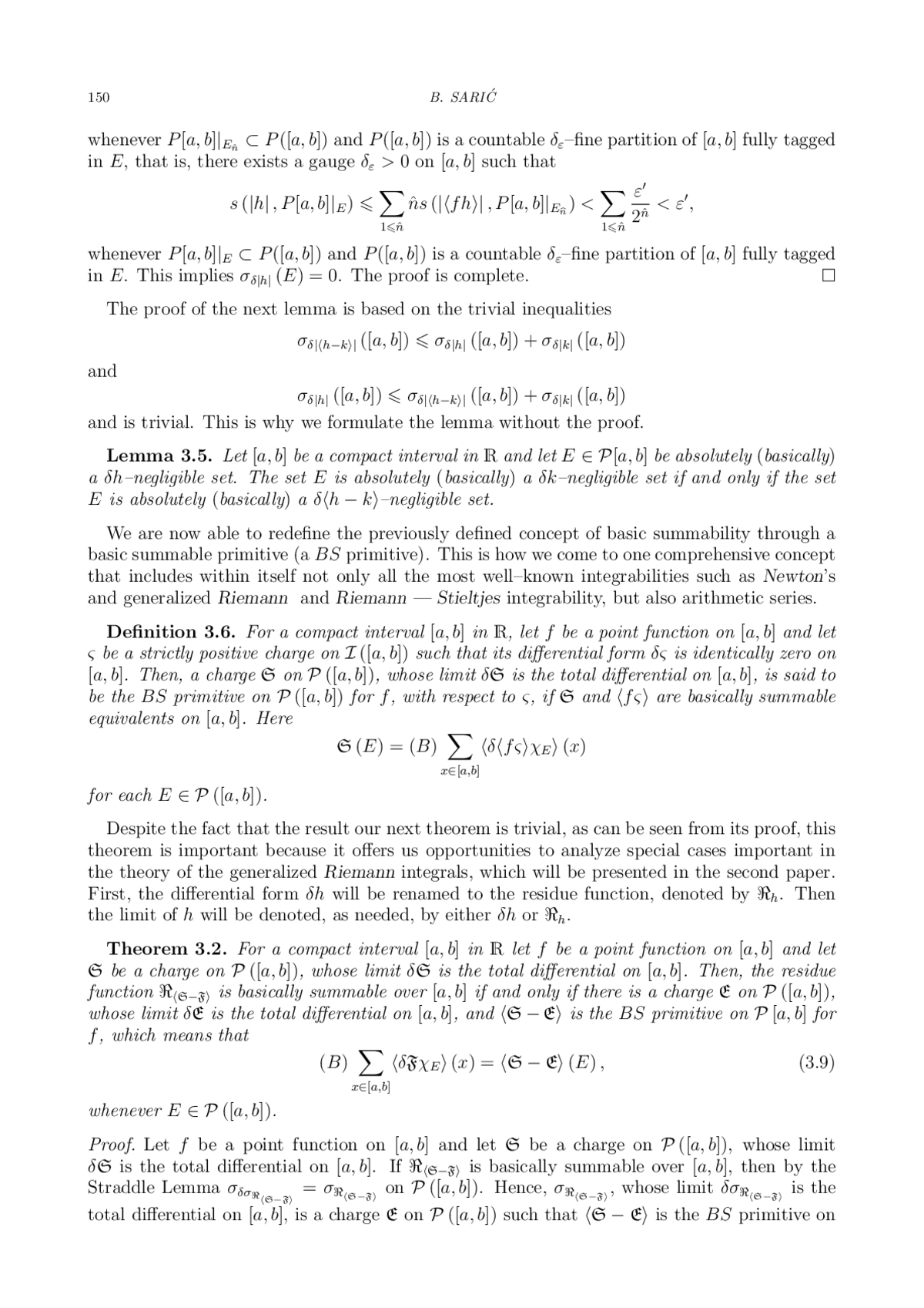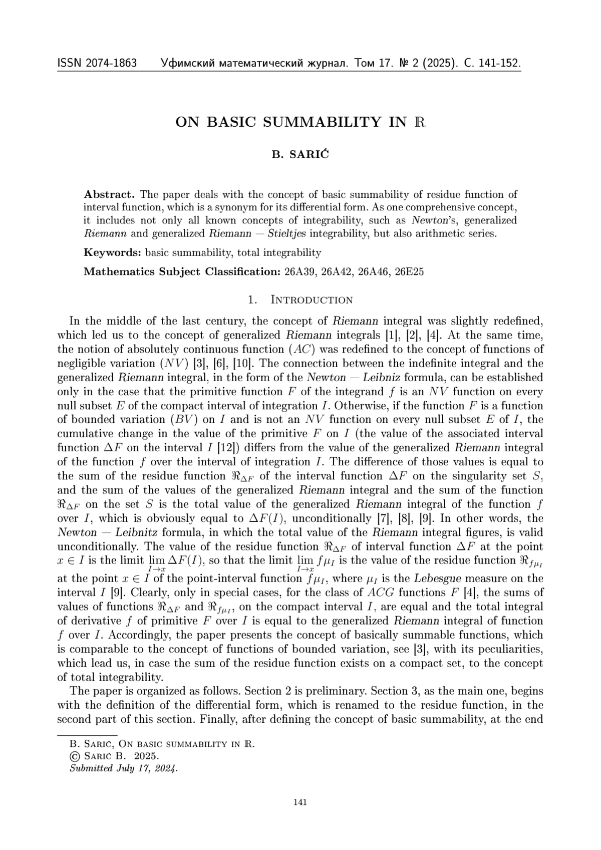 The paper deals with the concept of basic summability of residue function of interval function, which is a synonym for its differential form. As one comprehensive concept, it includes not only all known concepts of integrability, such as Newton’s, generalized Riemann and generalized Riemann — Stieltjes integrability, but also arithmetic series
