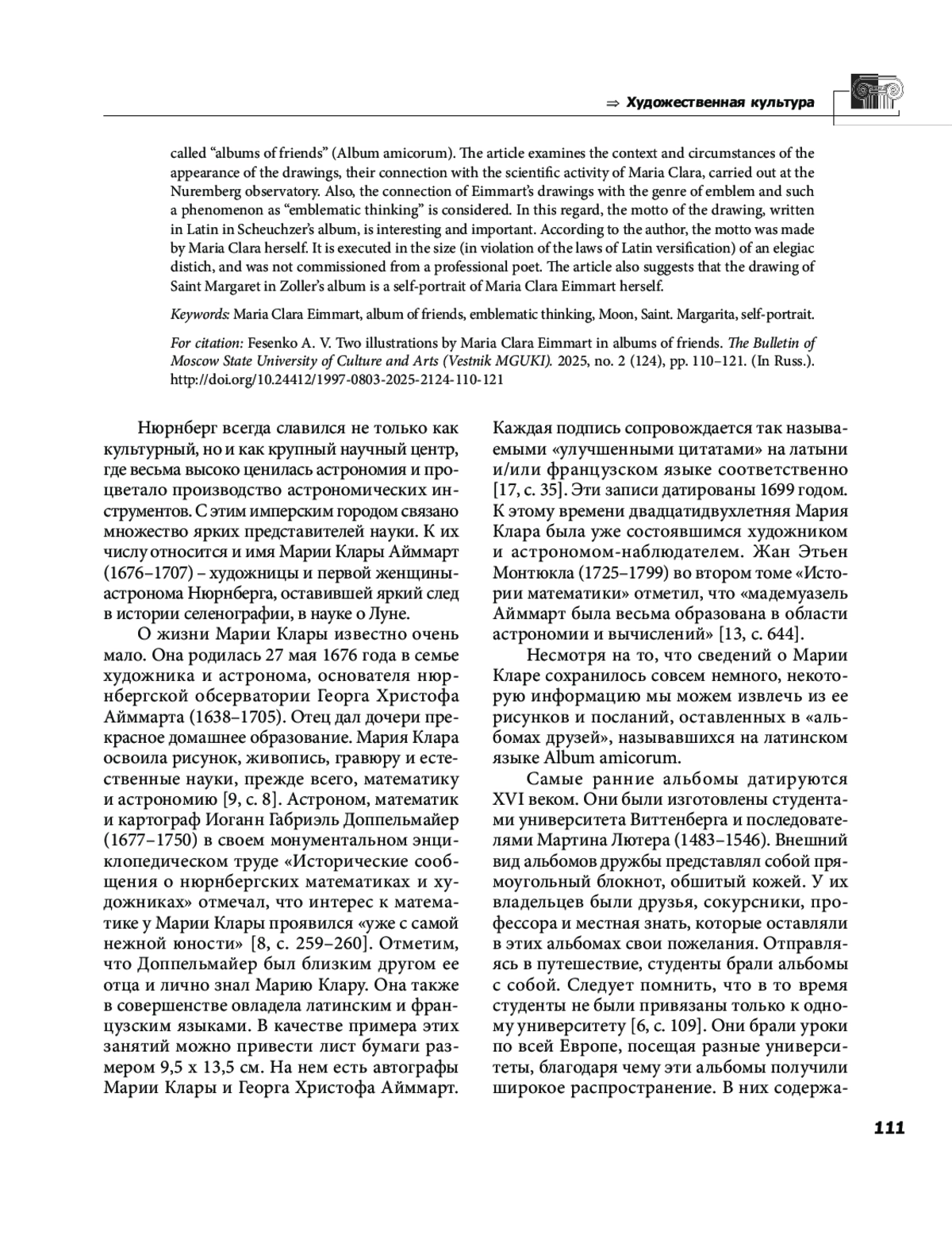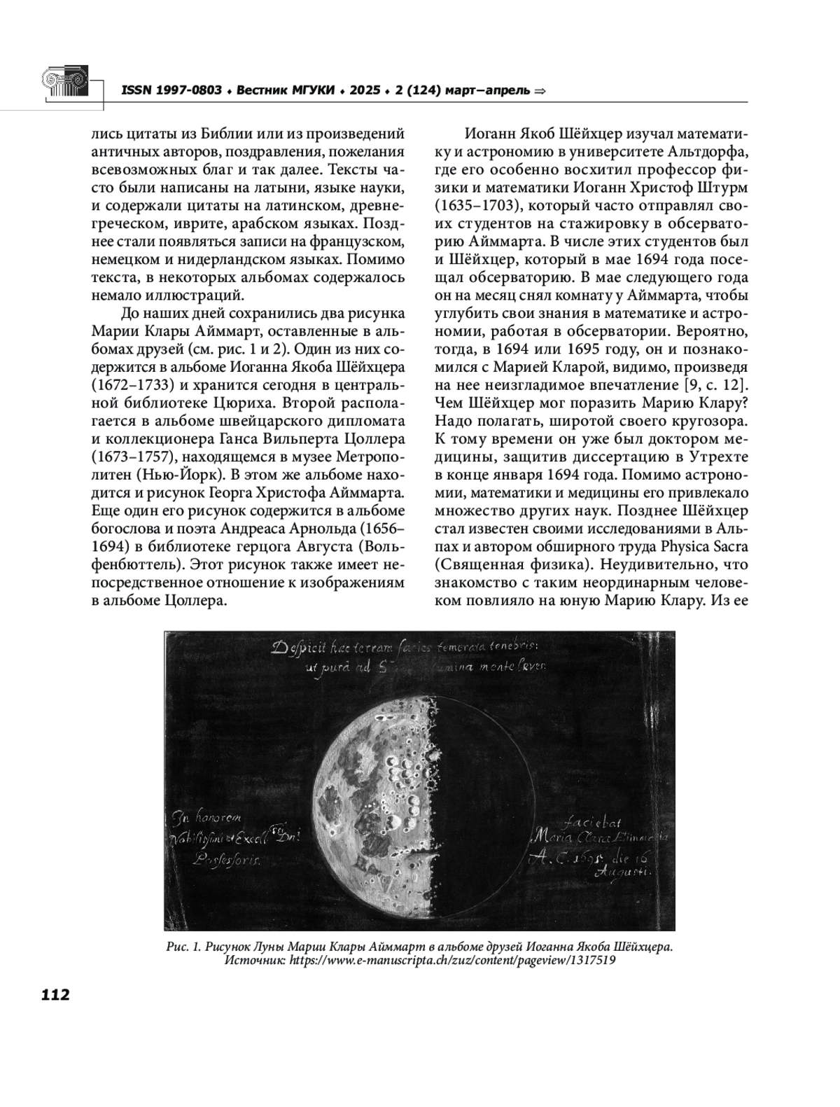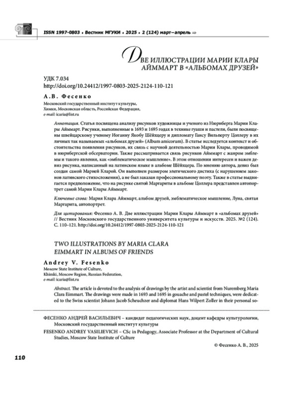 Статья посвящена анализу рисунков художницы и ученого из Нюрнберга Марии Клары Айммарт. Рисунки, выполненные в 1693 и 1695 годах в технике гуаши и пастели, были посвящены швейцарскому ученому Иоганну Якобу Шёйхцеру и дипломату Гансу Вильперту Цоллеру в их личных так называемых «альбомах друзей» (Album amicorum). В статье исследуется контекст и обстоятельства появления рисунков, их связь с научной деятельностью Марии Клары, проводимой в нюрнбергской обсерватории. Также рассматривается связь рисунков Айммарт с жанром эмблемы и такого явления, как «эмблематическое мышление». В этом отношении интересен и важен девиз рисунка, написанный на латинском языке в альбоме Шёйхцера. По мнению автора, девиз был создан самой Марией Кларой. Он выполнен размером элегического дистиха (с нарушением законов латинского стихосложения), а не был заказан профессиональному поэту. Также в статье выдвигается предположение, что на рисунке святой Маргариты в альбоме Цоллера представлен автопортрет самой Марии Клары Айммарт.