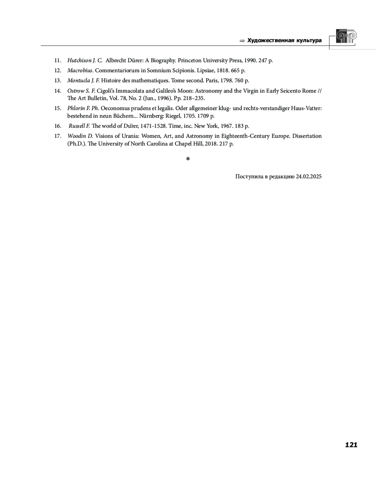 14. Ostrow S. F. Cigoli’s Immacolata and Galileo’s Moon: Astronomy and the Virgin in Early Seicento Rome // The Art Bulletin, Vol. 78, No. 2 (Jun., 1996). Pp. 218-235.