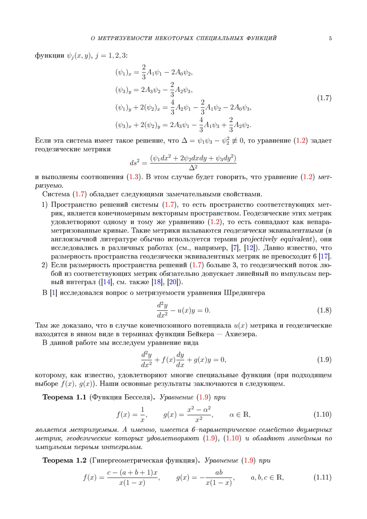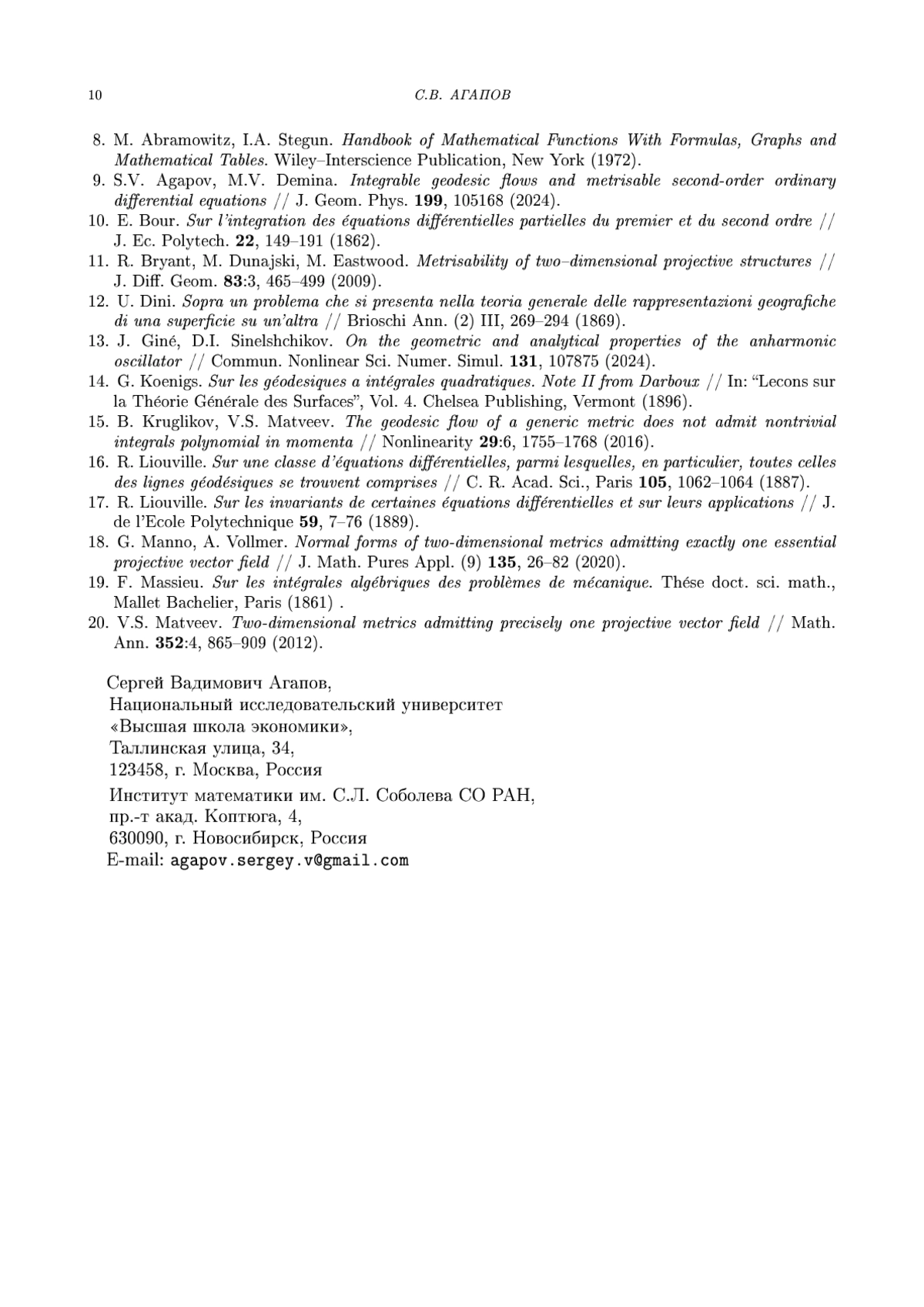 18. G. Manno, A. Vollmer. Normal forms of two-dimensional metrics admitting exactly one essential projective vector field // J. Math. Pures Appl. (9) 135, 26-82 (2020).