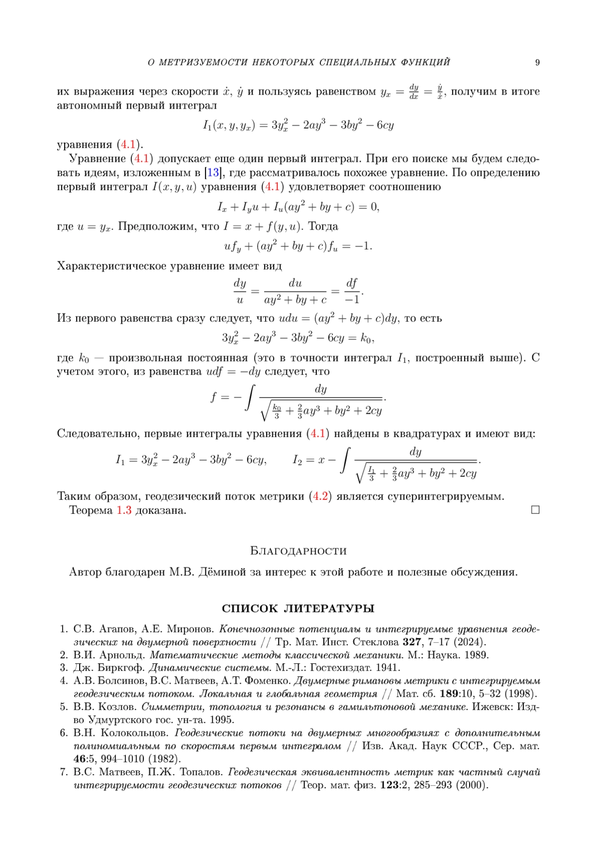 9. S.V. Agapov, M.V. Demina. Integrable geodesic flows and metrisable second-order ordinary differential equations // J. Geom. Phys. 199, 105168 (2024). EDN: CZBCOC