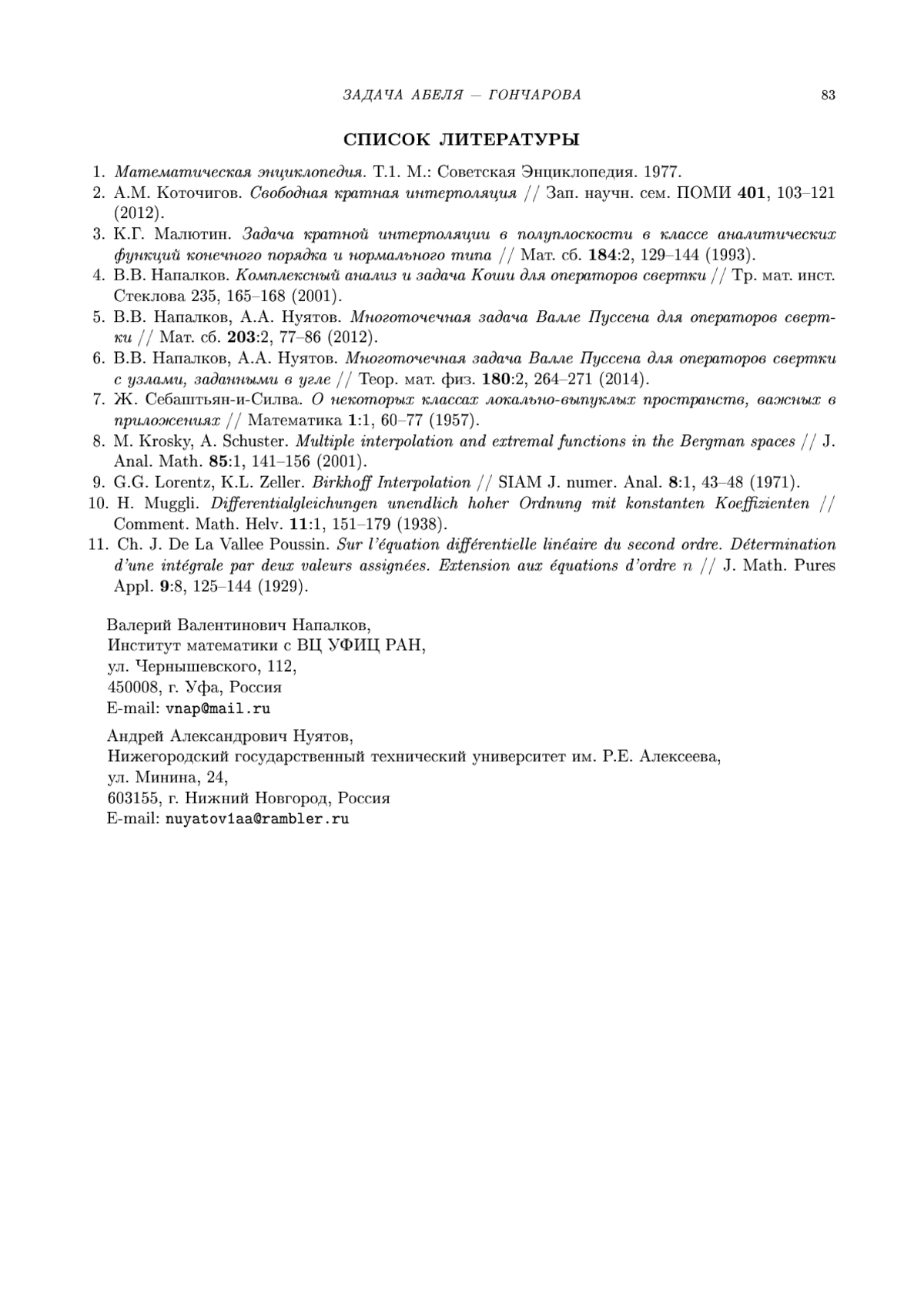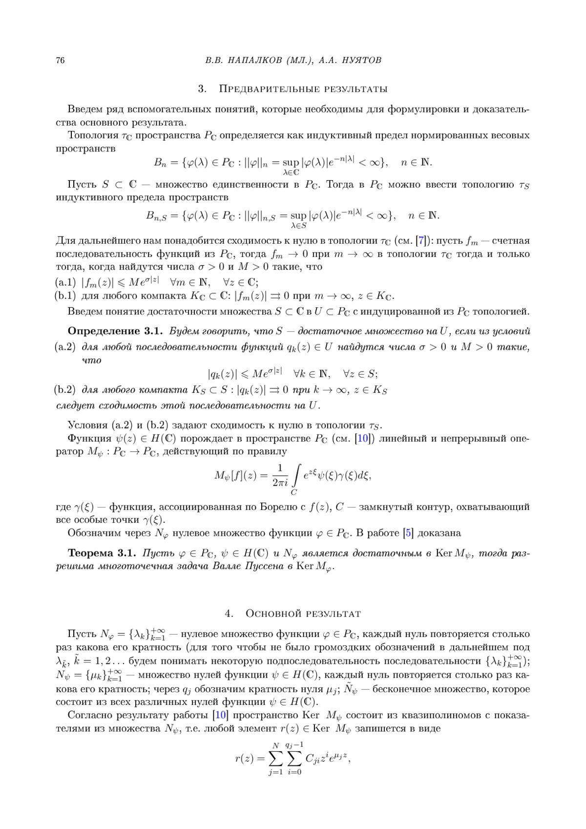 5. В.В. Напалков, А.А. Нуятов. Многоточечная задача Валле Пуссена для операторов свертки // Мат. сб. 203:2, 77-86 (2012).