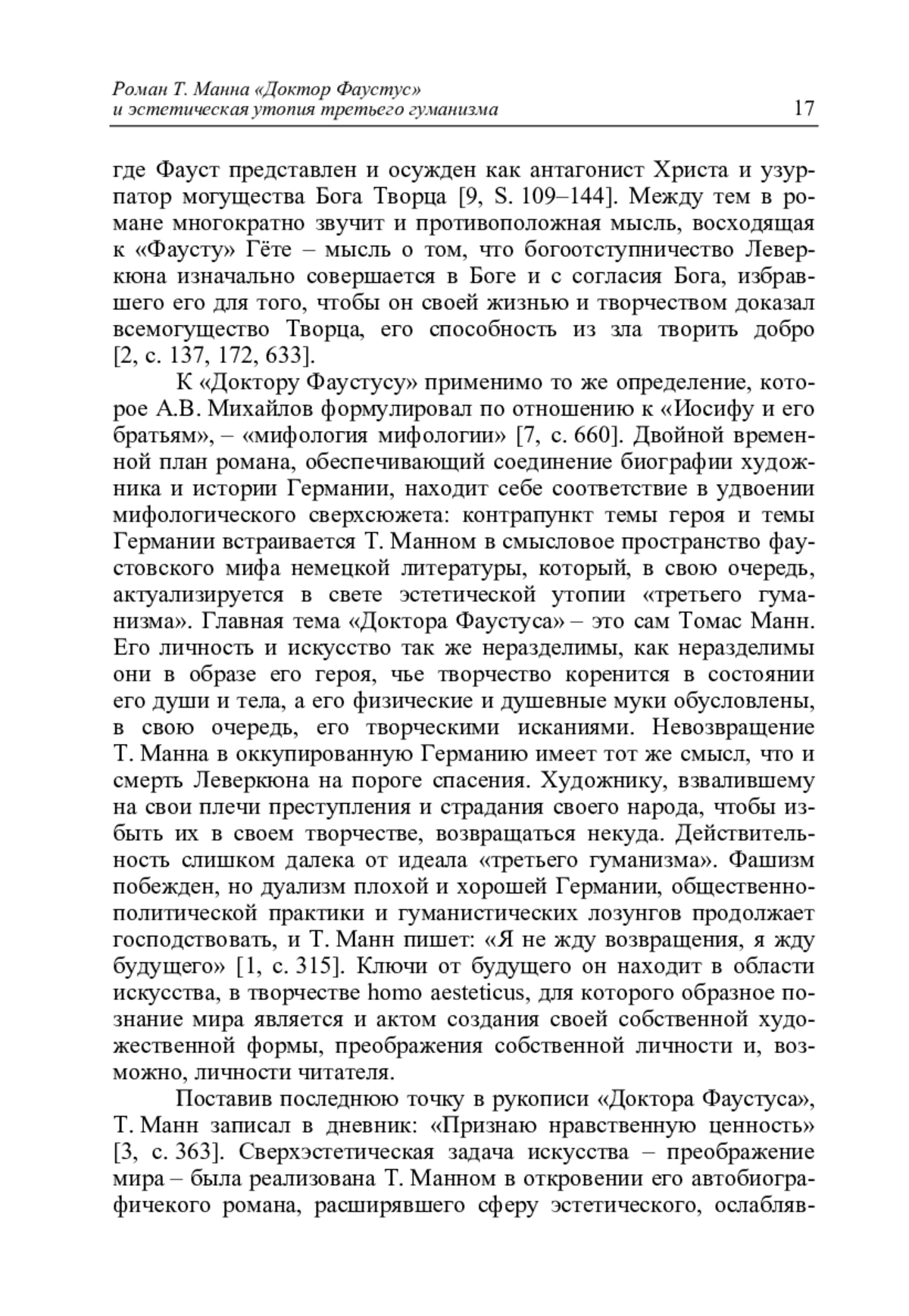 В статье исследуется место и роль в идейной структуре «Доктора Фаустуса» антифашистской концепции «третьего гуманизма», сформировавшейся в сознании Томаса Манна и ряда его современников в ответ на обострение кризиса гуманистической мысли, обусловленное временной победой в Германии нацистской идеологии. В обширной литературе вопроса содержание итогового романа писателя нередко рассматривалось как художественное исследование вырождения модернистского искусства, в котором поиски новых эстетических форм обернулись подчинением перспективе исторического зла. Автор пересматривает эту оценку, доказывая, что корреляция между трагедией искусства и трагедией Германии не означает их тождества. Контрапункт темы гибнущего героя-художника и гибнущей Германии встраивается Т. Манном в смысловое поле фаустовского мифа немецкой литературы, который в свою очередь актуализируется в свете эстетической утопии третьего гуманизма. Именно она и дает ключ к пониманию романа, является его основным мифом. Союз героя с силами зла мыслится Т. Манном как переходная, лиминальная фаза на пути от критической к органической культуре, к возрождению гуманизма под знаком преодоления трагического разрыва между гуманистической мыслью и антигуманной общественно-политической практикой, между духом и плотью. Их грядущий синтез представляет собой главную тему романа – тему «прорыва» к искусству, понимаемому как творчество жизни.