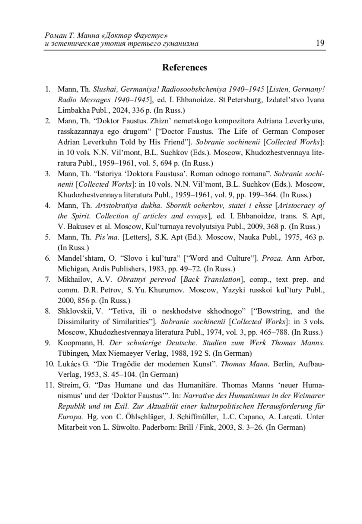 The article examines the place and role in the ideological structure of the final Doctor Faustus of the anti-fascist concept of the “third humanism”, formed in the minds of Thomas Mann and a number of his contemporaries in response to the aggravation of the crisis of humanistic thought caused by the temporary victory of fascist ideology in Germany. In the extensive literature on the issue, the content of the writerʼs final novel has often been considered as an artistic study of the degeneration of modernist art, in which the search for new aesthetic forms turned into subordination to the perspective of historical evil. The author revises this assessment, proving that the correlation between the tragedy of art and the tragedy of Germany does not mean their identity. The counterpoint of the theme of the dying heroartist and the dying Germany is built by T. Mann into the semantic field of the Faustian myth of German literature, which, in turn, is actualized in the light of the aesthetic utopia of the third humanism. It is precisely this that provides the key to understanding the novel, and is its main myth. The heroʼs alliance with the forces of evil is conceived by T. Mann as a transitional, liminal phase on the critical path to organic culture, to the revival of humanism under the sign of overcoming the tragic gap between humanistic thought and inhuman socio-political practice, between spirit and flesh. Their coming synthesis is the main theme of the novel – the theme of a “breakthrough” to art, understood as the creativity of life.