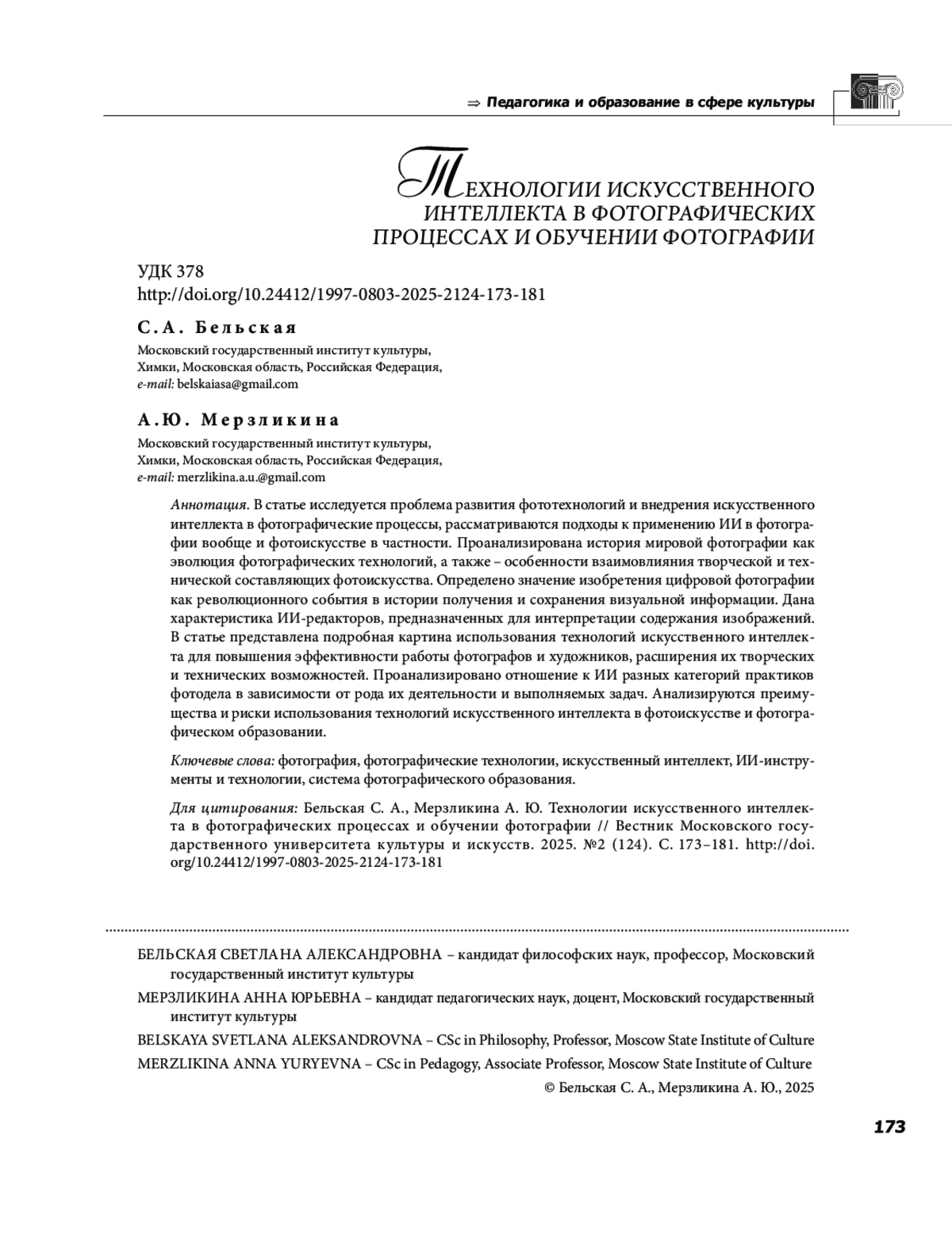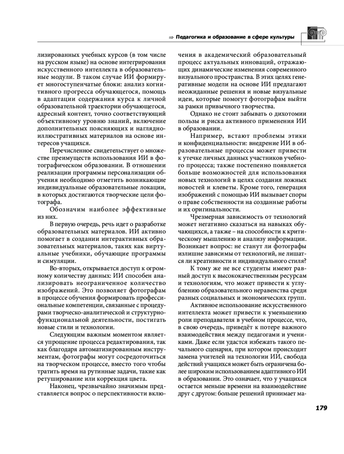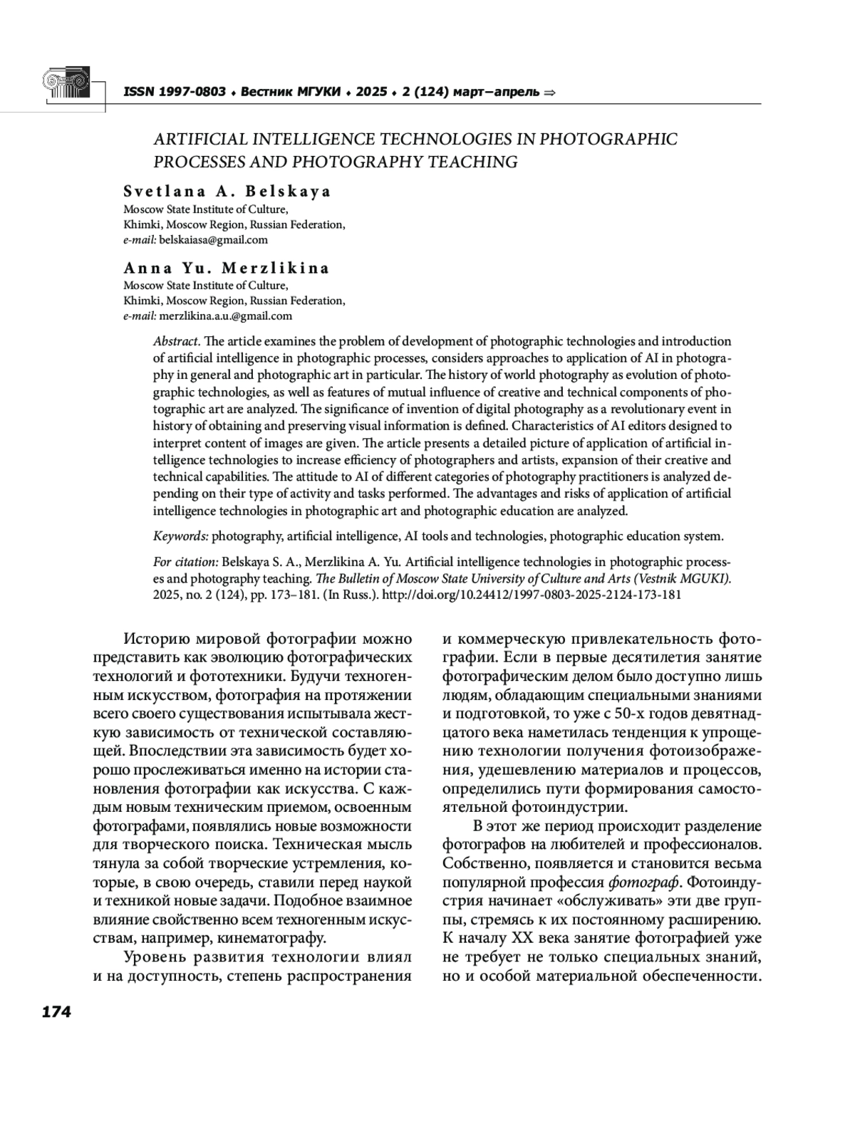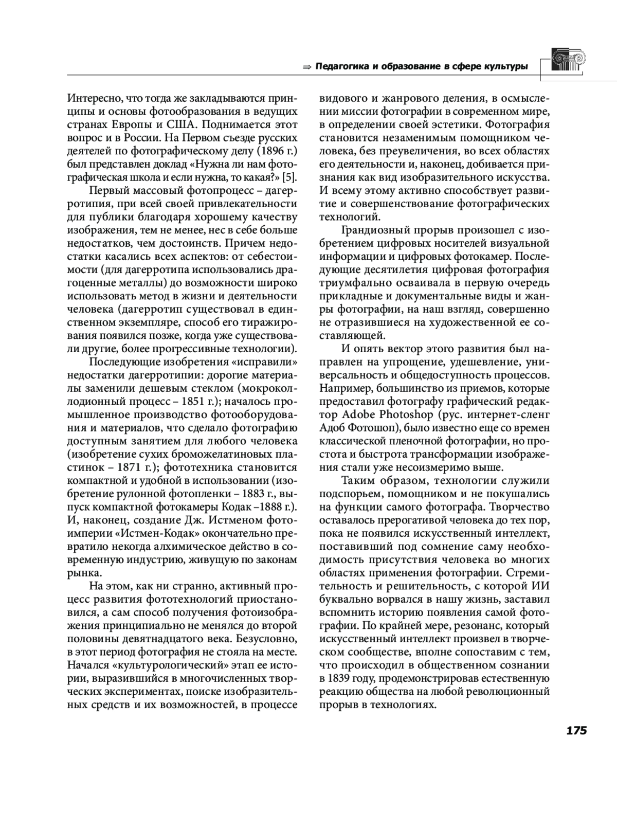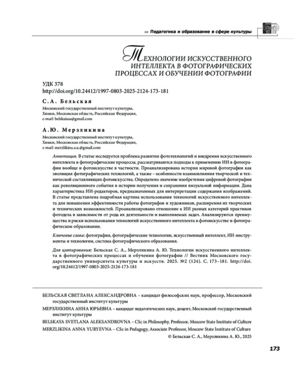 В статье исследуется проблема развития фототехнологий и внедрения искусственного интеллекта в фотографические процессы, рассматриваются подходы к применению ИИ в фотографии вообще и фотоискусстве в частности. Проанализирована история мировой фотографии как эволюция фотографических технологий, а также особенности взаимовлияния творческой и технической составляющих фотоискусства. Определено значение изобретения цифровой фотографии как революционного события в истории получения и сохранения визуальной информации. Дана характеристика ИИ редакторов, предназначенных для интерпретации содержания изображений. В статье представлена подробная картина использования технологий искусственного интеллекта для повышения эффективности работы фотографов и художников, расширения их творческих и технических возможностей. Проанализировано отношение к ИИ разных категорий практиков фотодела в зависимости от рода их деятельности и выполняемых задач. Анализируются преимущества и риски использования технологий искусственного интеллекта в фотоискусстве и фотографическом образовании.