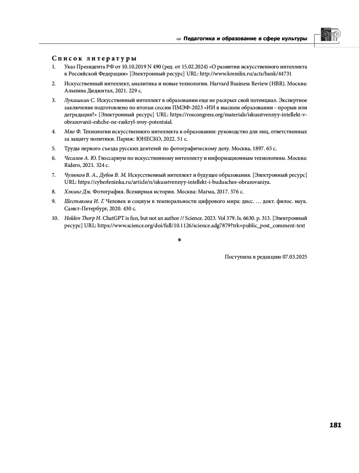 7. Чулюков В. А., Дубов В. М. Искусственный интеллект и будущее образования. [Электронный ресурс]URL:https://cyberleninka.ru/article/n/iskusstvennyy-intellekt-i-buduschee-obrazovaniya.