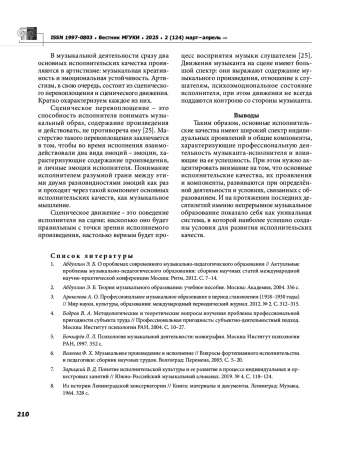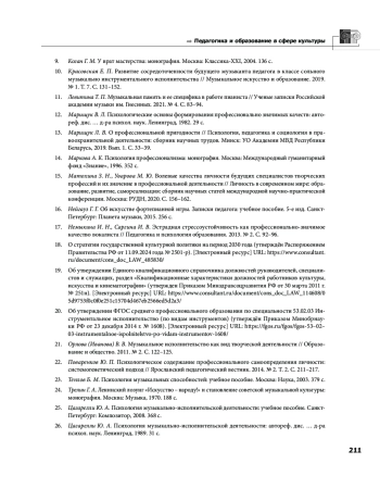 10. Красовская Е. П. Развитие сосредоточенности будущего музыканта педагога в классе сольного музыкально инструментального исполнительства // Музыкальное искусство и образование. 2019. № 1. Т. 7. С. 131-152. EDN: YWSYEX