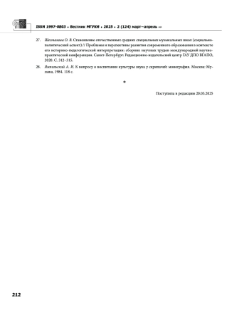 27. Шестакова О. В. Становление отечественных средних специальных музыкальных школ (социально политический аспект) // Проблемы и перспективы развития современного образования в контексте его историко-педагогической интерпретации: сборник научных трудов международной научно практической конференции. Санкт-Петербург: Редакционно издательский центр ГАУ ДПО ВГАПО, 2020. С. 312-315. EDN: CQMCHF
