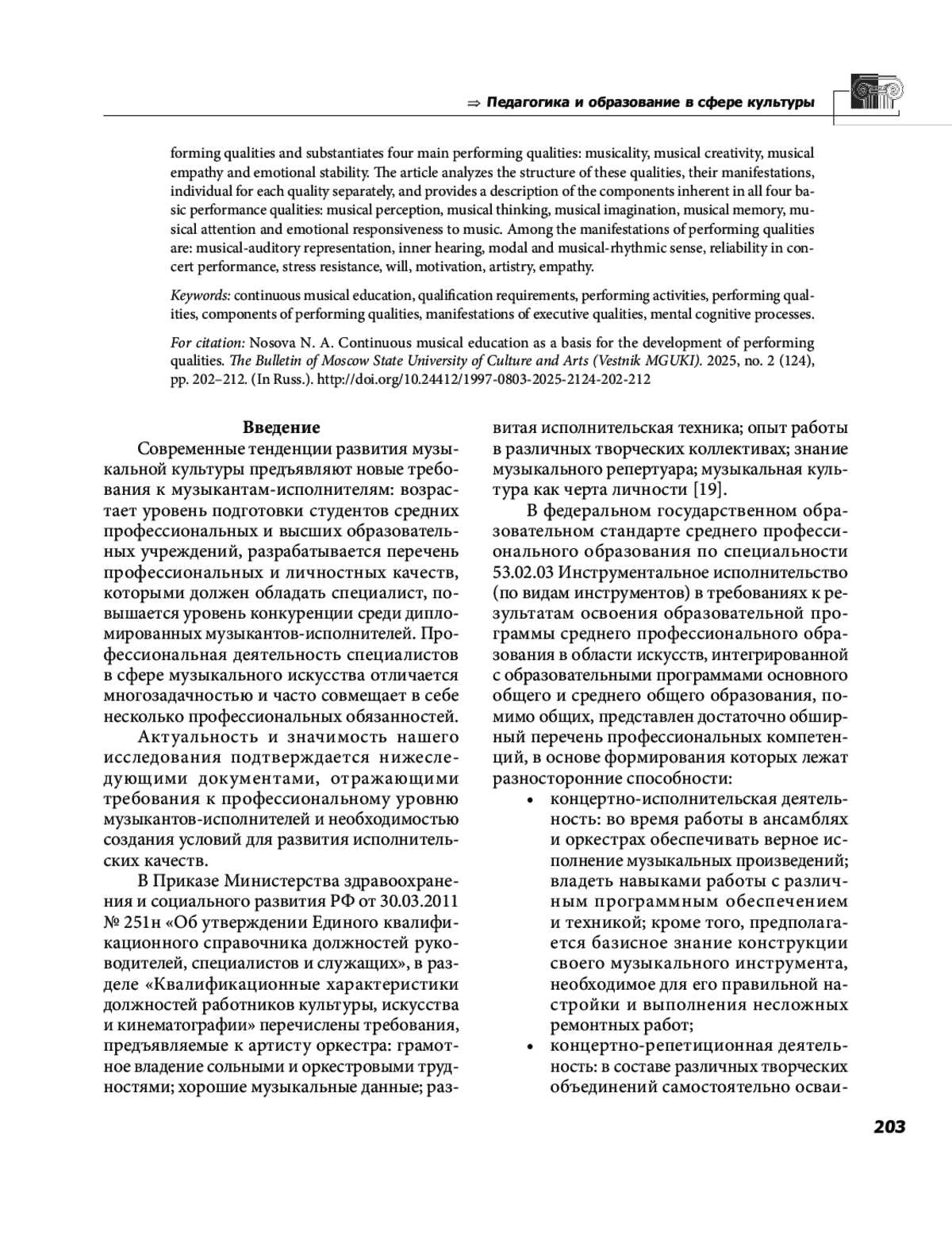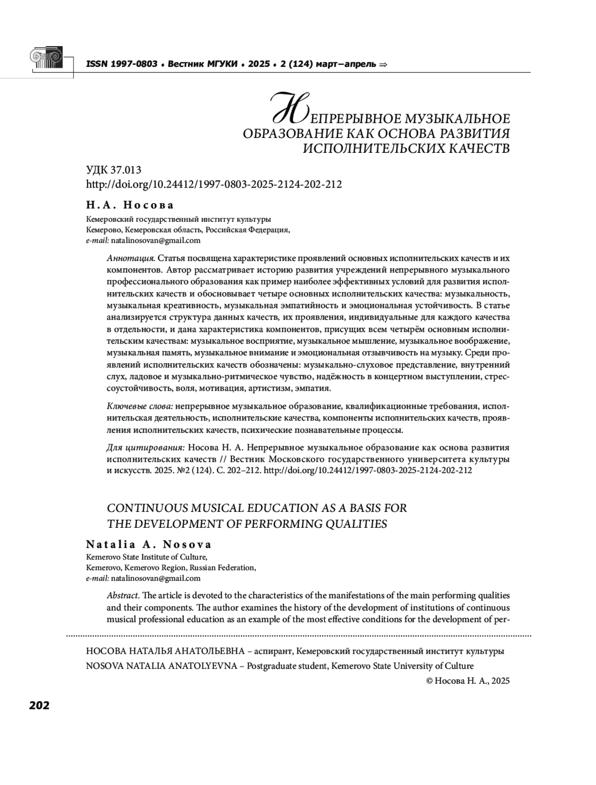Статья посвящена характеристике проявлений основных исполнительских качеств и их компонентов. Автор рассматривает историю развития учреждений непрерывного музыкального профессионального образования как пример наиболее эффективных условий для развития исполнительских качеств и обосновывает четыре основных исполнительских качества: музыкальность, музыкальная креативность, музыкальная эмпатийность и эмоциональная устойчивость. В статье анализируется структура данных качеств, их проявления, индивидуальные для каждого качества в отдельности, и дана характеристика компонентов, присущих всем четырём основным исполнительским качествам: музыкальное восприятие, музыкальное мышление, музыкальное воображение, музыкальная память, музыкальное внимание и эмоциональная отзывчивость на музыку. Среди проявлений исполнительских качеств обозначены: музыкально слуховое представление, внутренний слух, ладовое и музыкально ритмическое чувство, надёжность в концертном выступлении, стрессоустойчивость, воля, мотивация, артистизм, эмпатия.