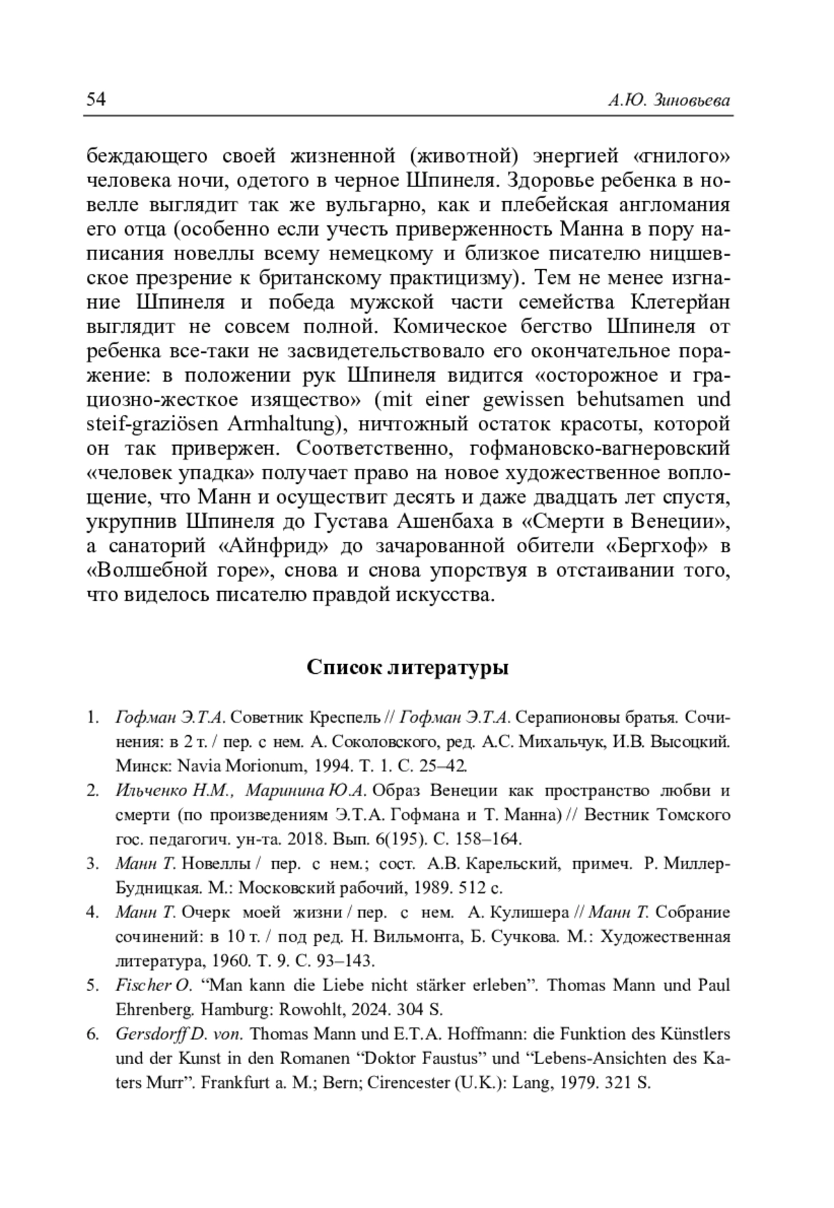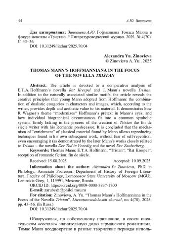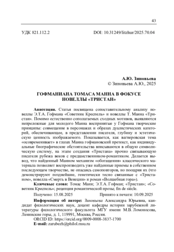 Зиновьева А.Ю. Гофманиана Томаса Манна в фокусе новеллы «Тристан» // Литературоведческий журнал. 2025. No 4(70). С. 43–56.