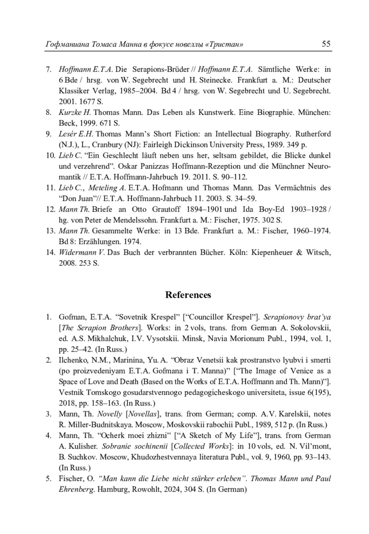 2. Ilchenko, N.M., Marinina, Yu. A. “Obraz Venetsii kak prostranstvo lyubvi i smerti (po proizvedeniyam E.T.A. Gofmana i T. Manna)” [“The Image of Venice as a Space of Love and Death (Based on the Works of E.T.A. Hoffmann and Th. Mann)”]. Vestnik Tomskogo gosudarstvennogo pedagogicheskogo universiteta, issue 6(195),