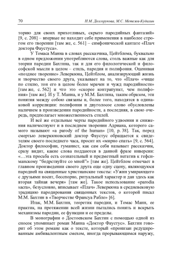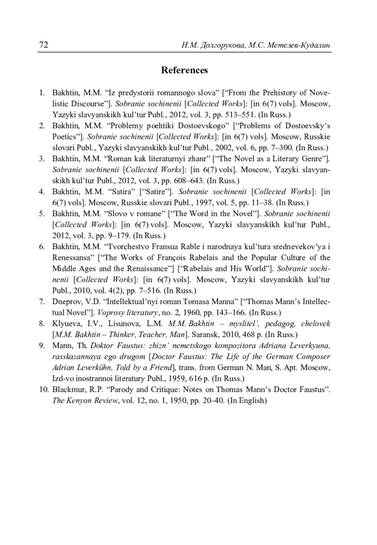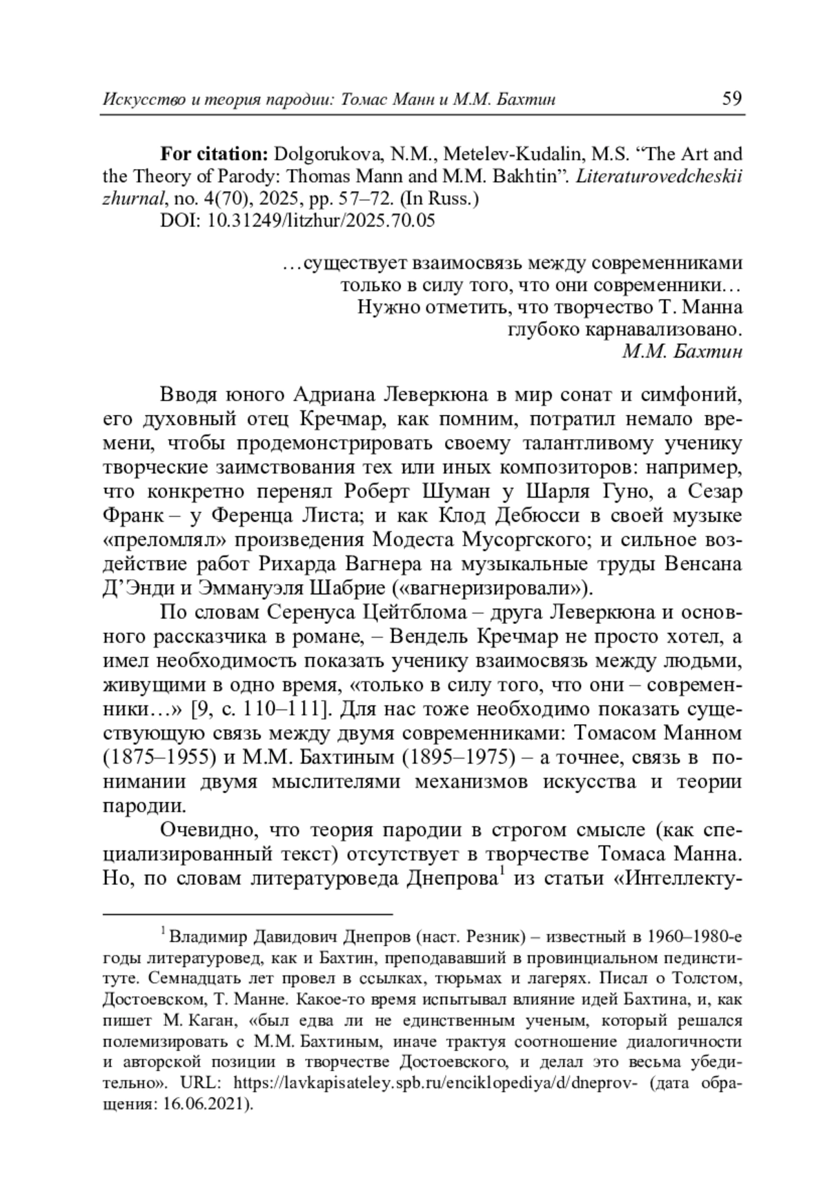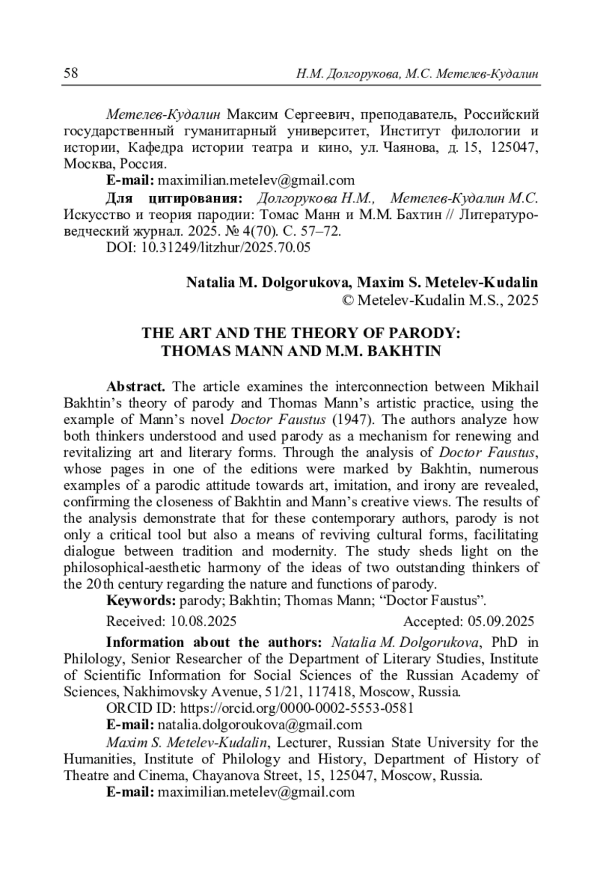 Долгорукова Н.М., Метелев-Кудалин М.С. Искусство и теория пародии: Томас Манн и М.М. Бахтин // Литературоведческий журнал. 2025. No 4(70). С. 57–72.