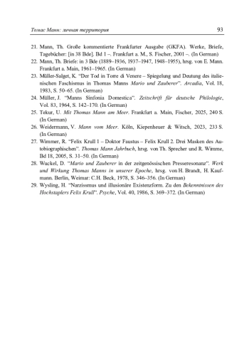 This article explores Thomas Mann’s strategy for including autobiographical moments in his works, focusing not on his diaries, correspondence, or essays, but rather on a group of short stories in which the writer appears simultaneously as narrator and protagonist. Particular attention is paid to the cycle Two Idylls (comprising “A Man and His Dog” and the hexametric poem “The Song of the Little Child”, both 1919), as well as to two later stories - “Disorder and Early Sorrow” (1925) and “Mario and the Magician” (1930). These works are frequently considered by scholars as forming a symbolic cycle referred to as Symphonia domestica, a title borrowed from the orchestral composition by R. Strauss, one of Mann’s favorite composers. The aim of this study is to identify the narrative and thematic mechanisms by which private and autobiographical experience is transformed into an artistic and ethical statement. The article examines the ways in which the writer’s personal world - family life, emotional vulnerability and every day rituals - becomes a testing ground for cultural reflection and moral choice. Key methodological approaches include narratological analysis, theories of autobiographical writing, and a contextual reading of the texts within the intellectual and political climate of interwar Europe. The analysis demonstrates that Mann’s turn to intimate and domestic subjects in the early 1920s signifies a crucial moment of self-reflection and ethical repositioning. By foregrounding the private sphere, Mann creates a space for humanistic introspection, exploring how ordinary emotional experience - sorrow, joy, loss - can serve as a counterpoint to the rising tide of nationalism and historical upheaval. The stories under consideration mark a transition toward a new phase in Mann’s work, characterized by a commitment to democratic ideals, anti-militarism, and the defense of human dignity. This narrative and ideological shift laid the foundation for the author’s later anti-fascist writings and affirmed literature’s potential to bear witness to spiritual resistance and ethical renewal.