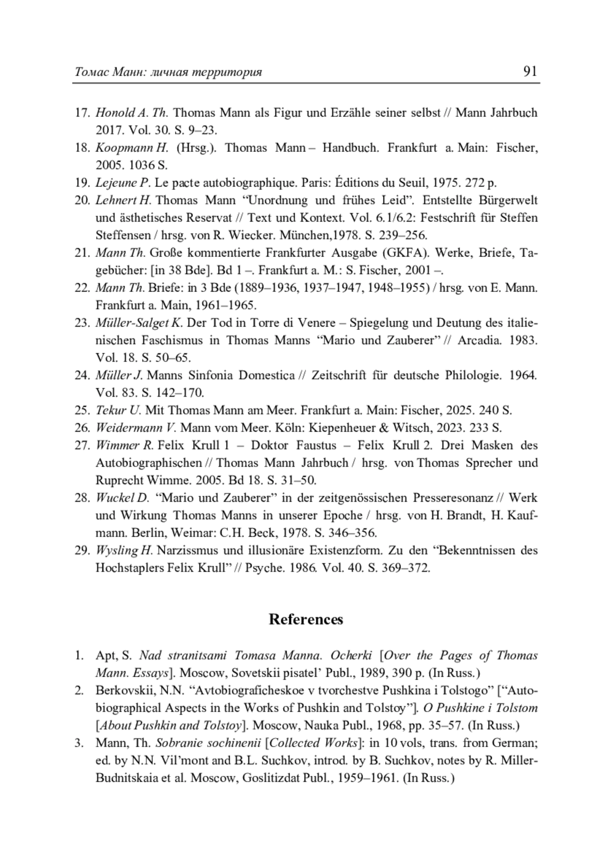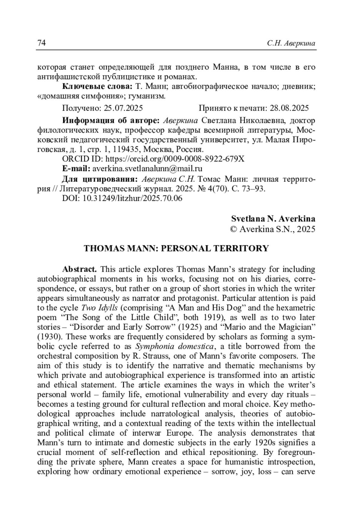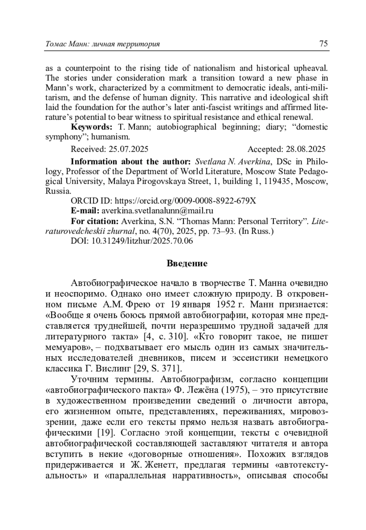 Аверкина С.Н. Томас Манн: личная территория // Литературоведческий журнал. 2025. No 4(70). С. 73–93.