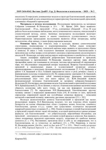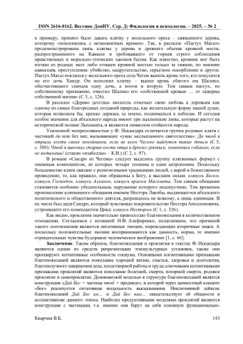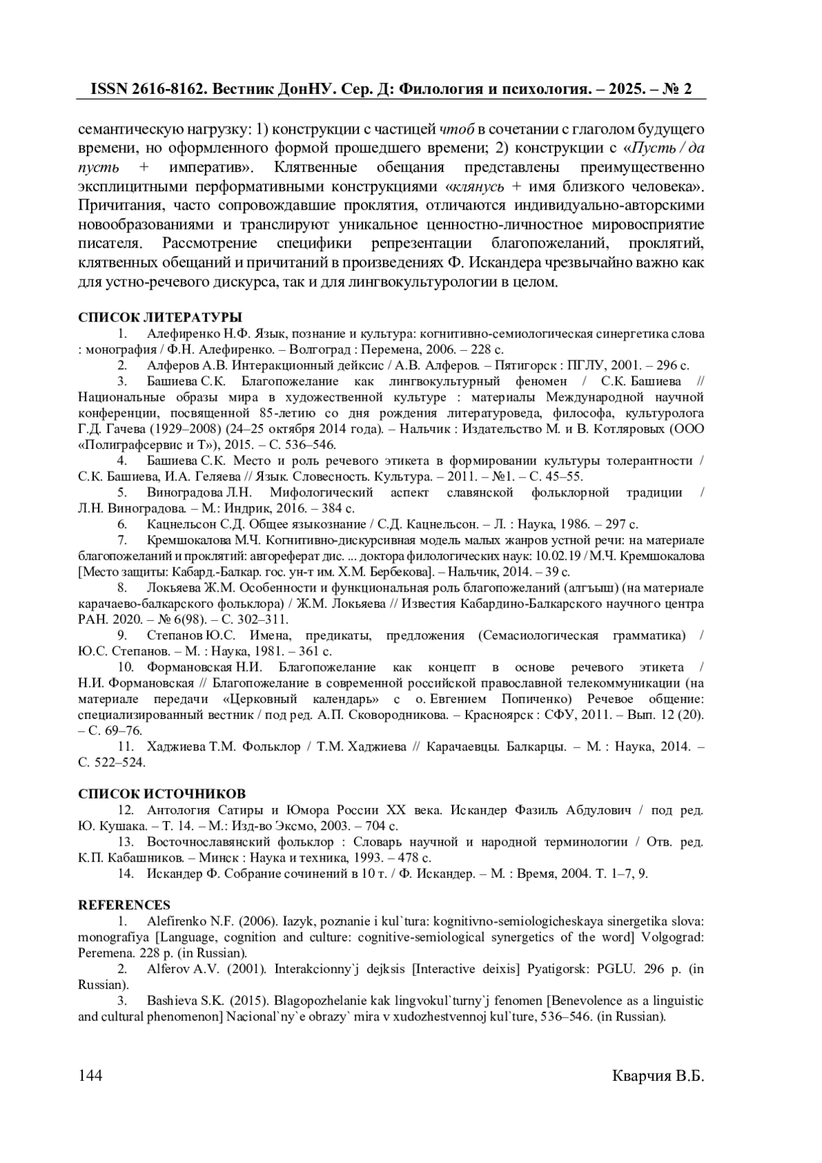 8. Локьяева Ж.М. Особенности и функциональная роль благопожеланий (алгъыш) (на материале карачаево-балкарского фольклора) / Ж.М. Локьяева // Известия Кабардино-Балкарского научного центра РАН. 2020. - № 6(98). - С. 302-311. EDN: ZQHGHK