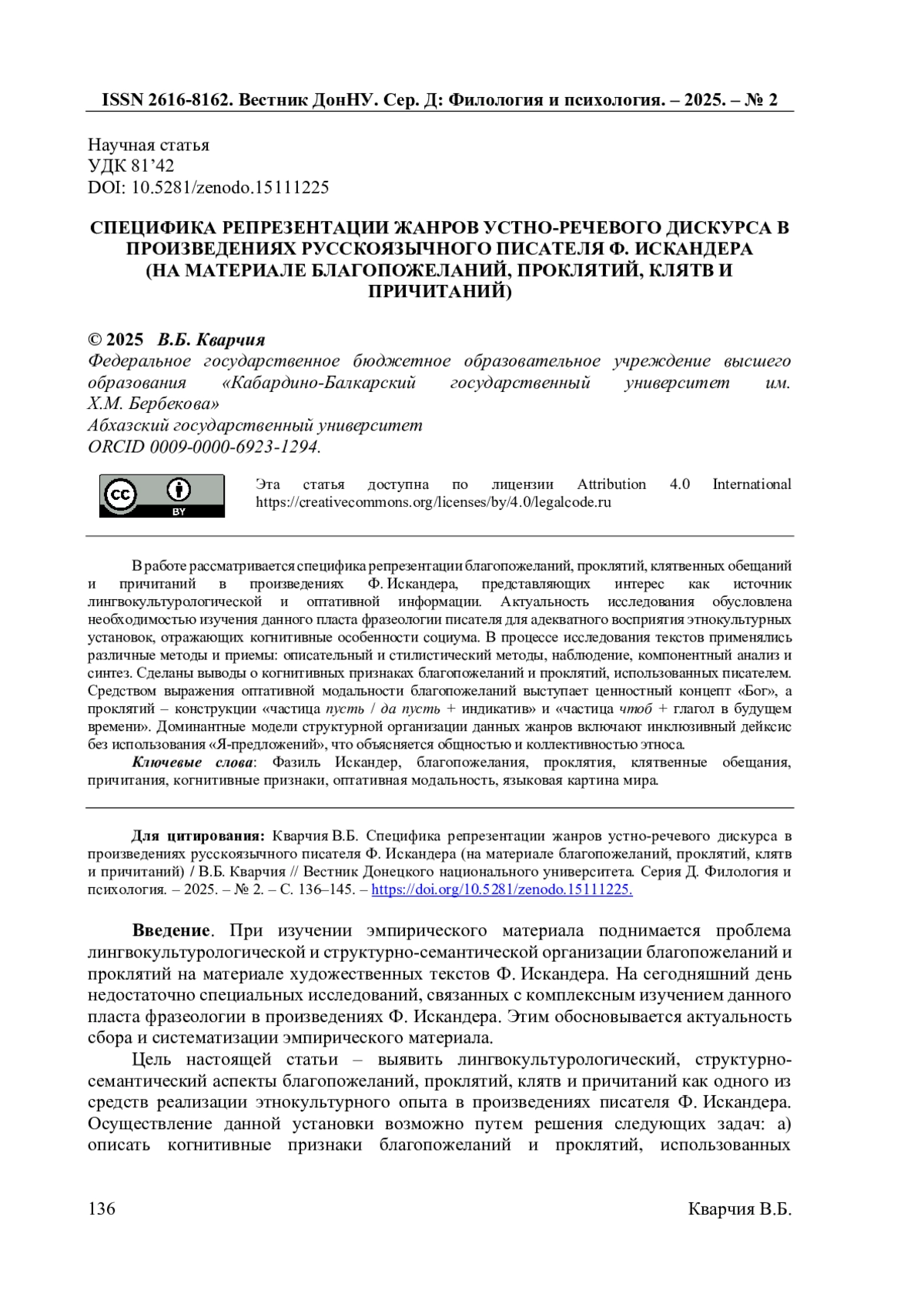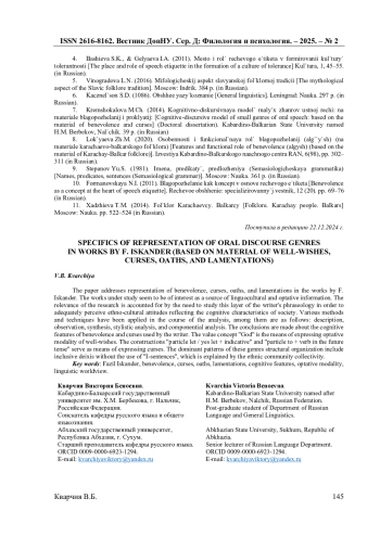 В работе рассматривается специфика репрезентации благопожеланий, проклятий, клятвенных обещаний и причитаний в произведениях Ф. Искандера, представляющих интерес как источник лингвокультурологической и оптативной информации. Актуальность исследования обусловлена необходимостью изучения данного пласта фразеологии писателя для адекватного восприятия этнокультурных установок, отражающих когнитивные особенности социума. В процессе исследования текстов применялись различные методы и приемы: описательный и стилистический методы, наблюдение, компонентный анализ и синтез. Сделаны выводы о когнитивных признаках благопожеланий и проклятий, использованных писателем. Средством выражения оптативной модальности благопожеланий выступает ценностный концепт «Бог», а проклятий - конструкции «частица пусть / да пусть + индикатив» и «частица чтоб + глагол в будущем времени». Доминантные модели структурной организации данных жанров включают инклюзивный дейксис без использования «Я-предложений», что объясняется общностью и коллективностью этноса.