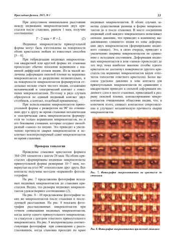 Проведен ряд стыковок кристаллов формата 384×288 с шагом 28 мкм с микроконтактами прямоугольной формы, повернутыми на угол 90о по отношению друг к другу. Представлены фотографии расстыкованных образцов. Показано, что при выполнении рекомендованных геометрических соотношений для размеров микроконтактов закорачивания не происходит.