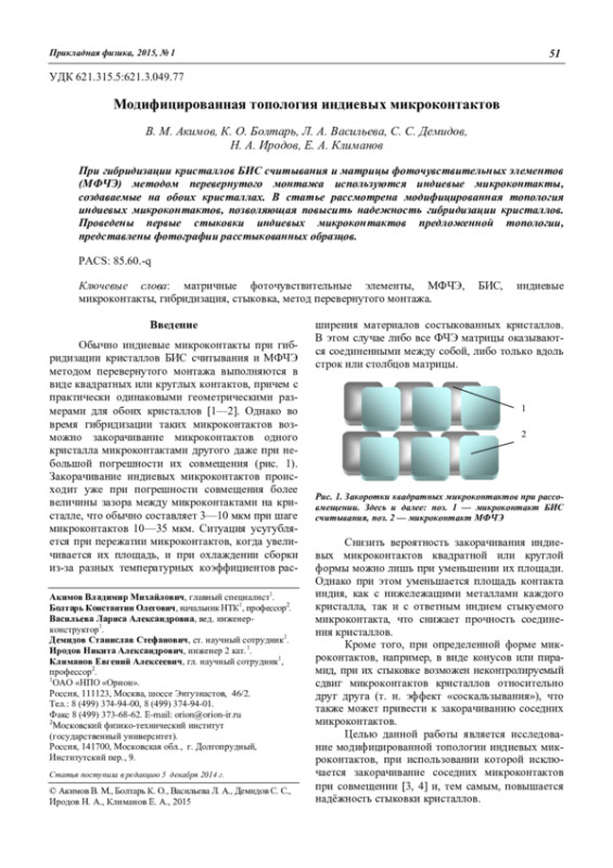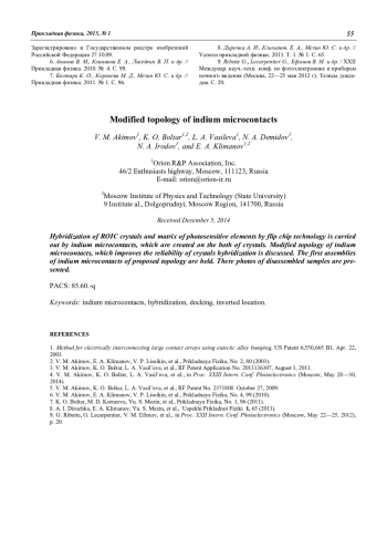 V. M. Akimov, K. O. Boltar, L. A. Vasileva, N. A. Demidov, N. A. Irodov, and E. A. Klimanov Modified topology of indium microcon-tacts 51