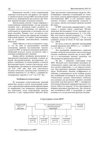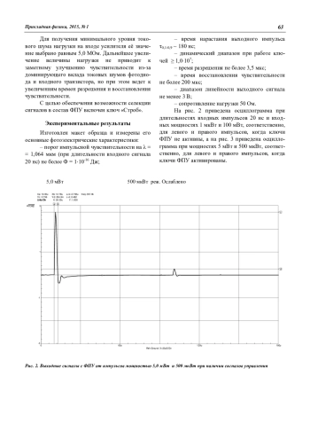 Данная работа посвящена рассмотрению и практической реализации различных схемных решений быстродействующих фотоприемных устройств, основанных на использовании в качестве фоточувствительного элемента фотодиодов, оптимизированных для приема на спектральный диапазон 0,85—1,067 мкм. При этом длительность входных оптических сигналов может изменяться в широком диапазоне от 5 до 400 нс, с уровнями регистрируемых энергий от 110-16 до 210-9 Дж.